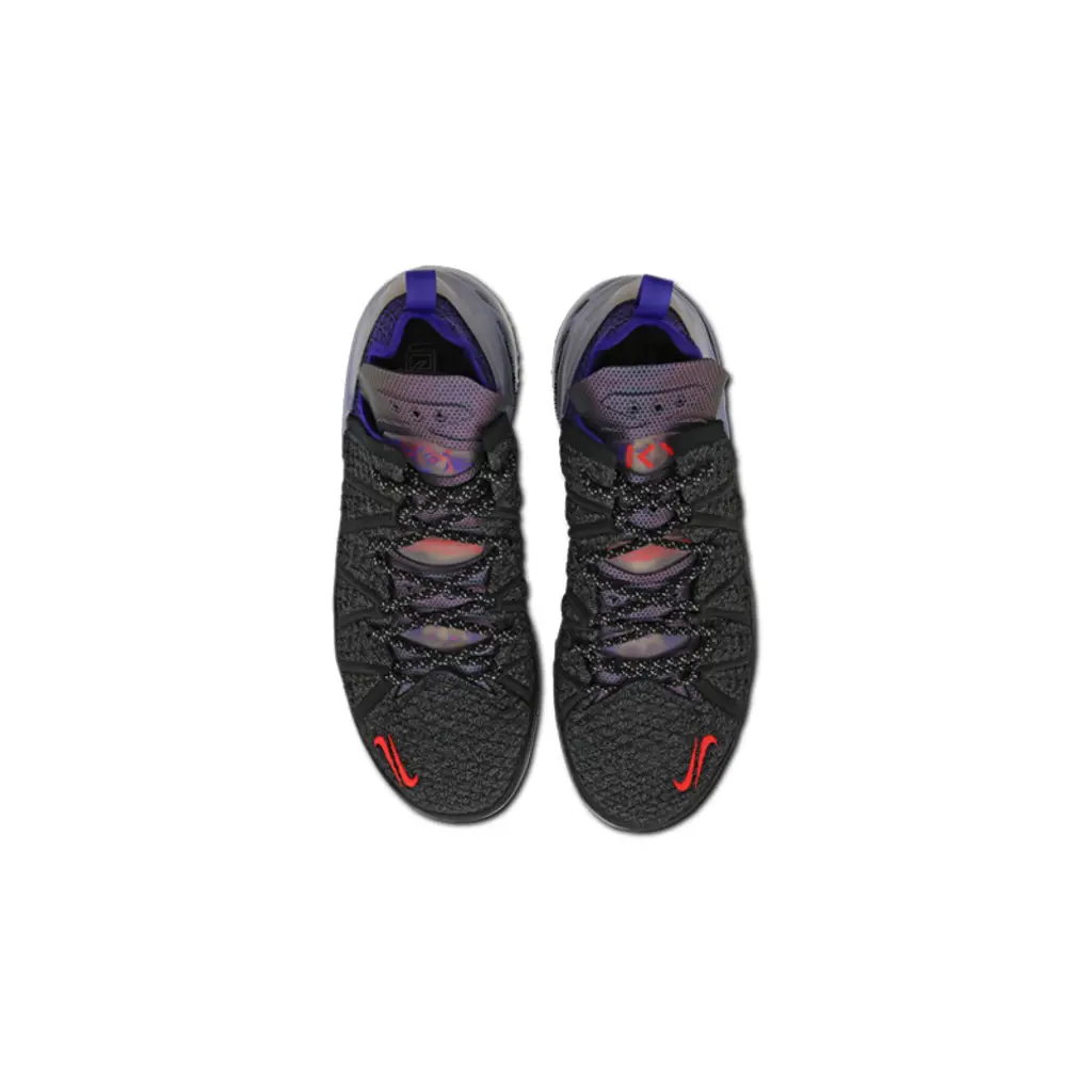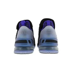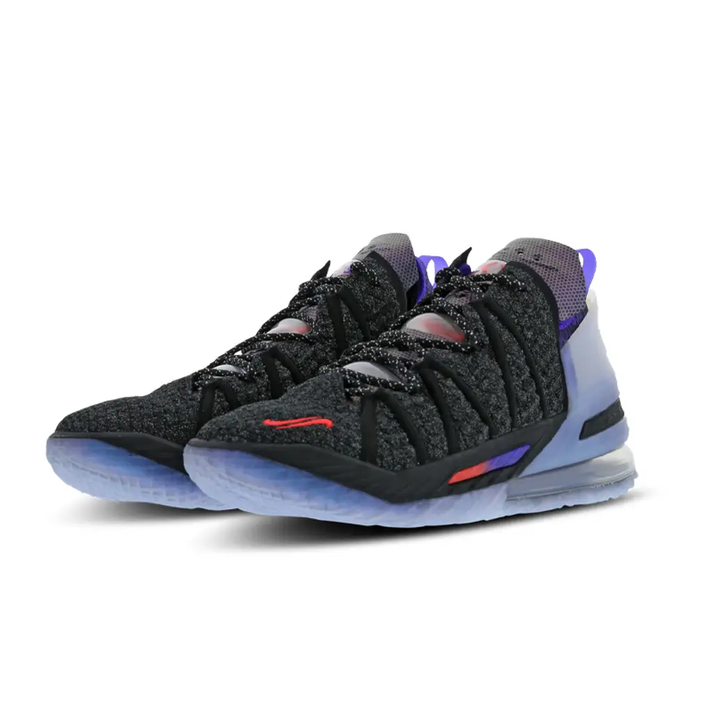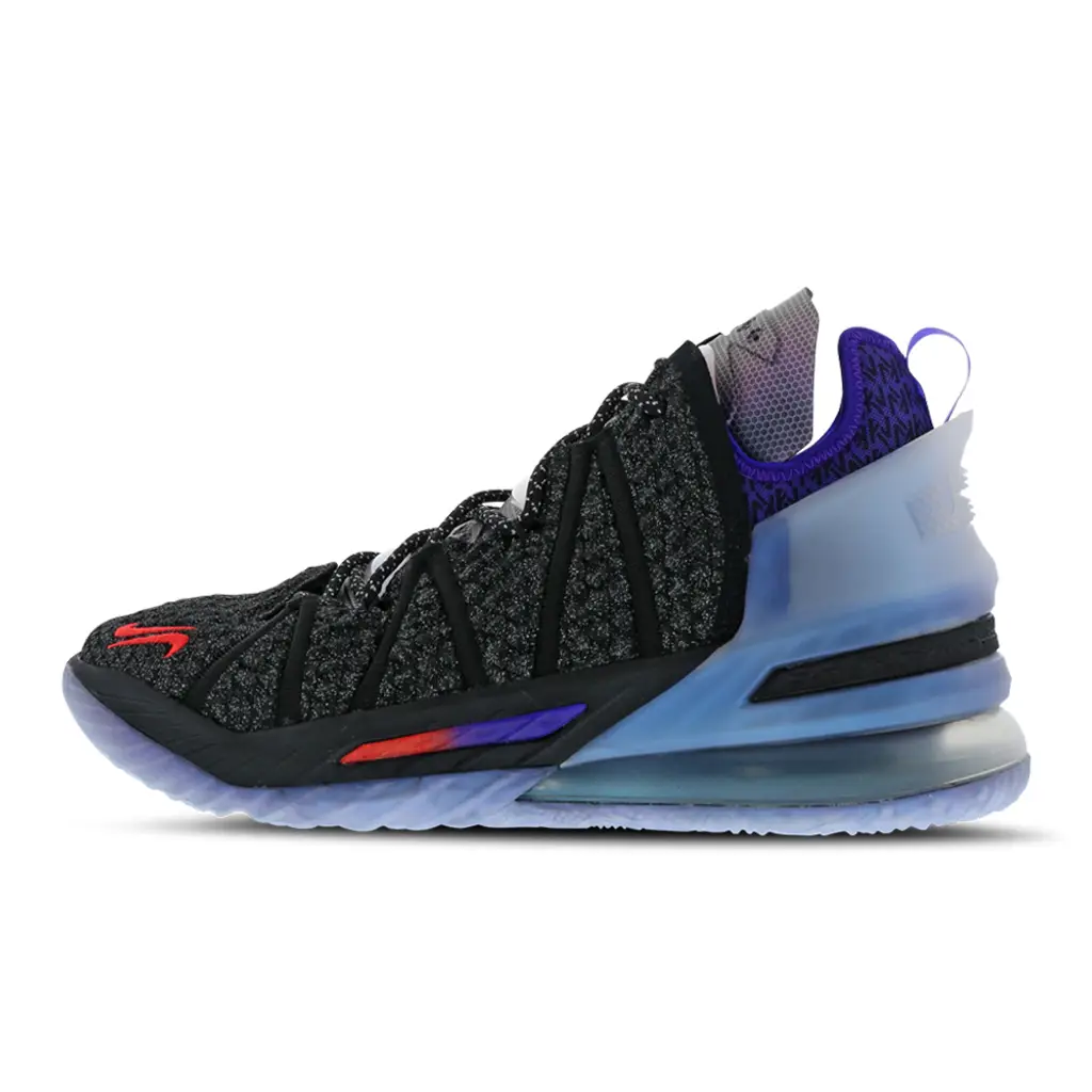 Seen here in hues of black and blue, everything about the sneaker instantly stands out. However, after taking a minute to take a closer look, the forefoot overlay envelops a knit textiles throughout in a smoke grey and stealthy black colorway for a super comfortable feel and stylish look at the same time. Further Nike branding details appear on the lateral toes as embroidered dual red Swooshes and Lebron 18 markings on the tongue to complete. Finalising the silhouette is an icy blue rubber heel cap matched with a Nike Air bubble fitted into a rubber outsole, overall providing comfort and cushioning that is unbeatable on and off the court