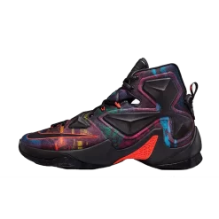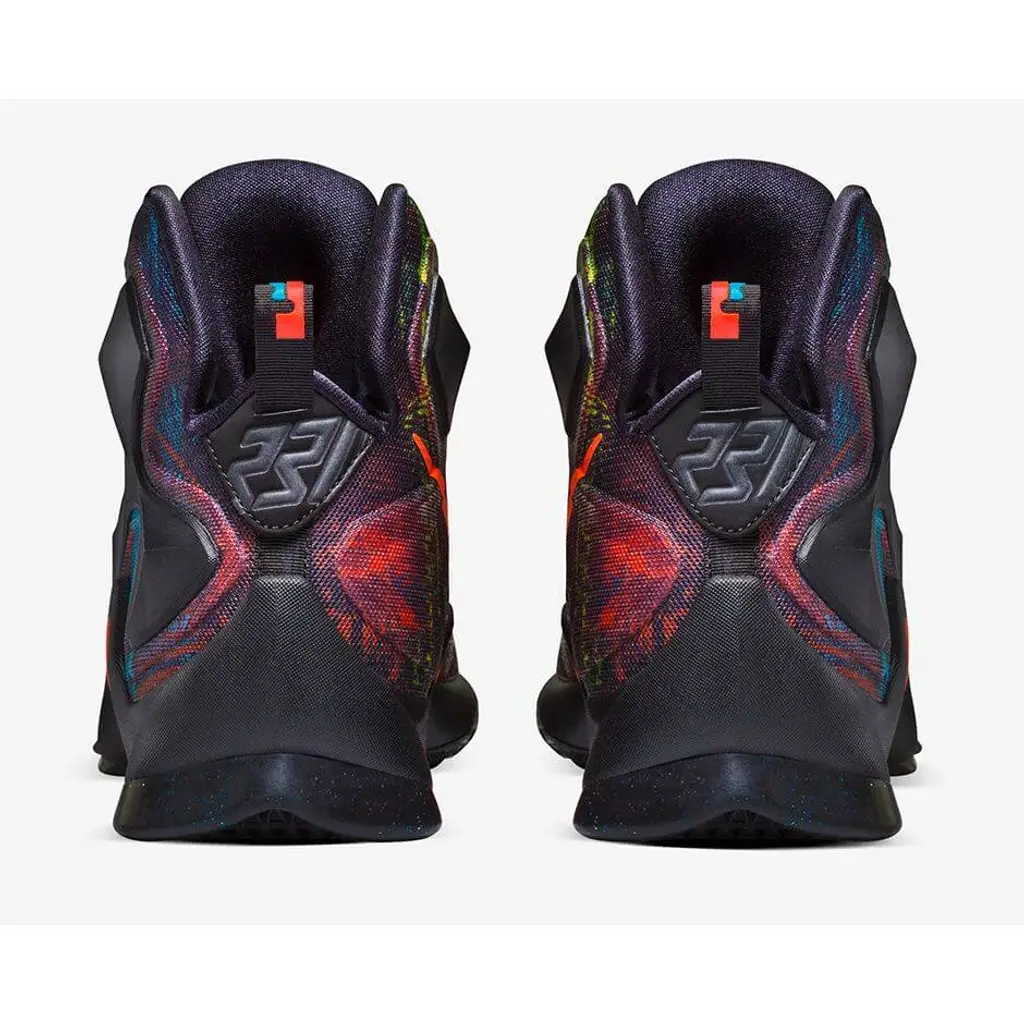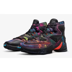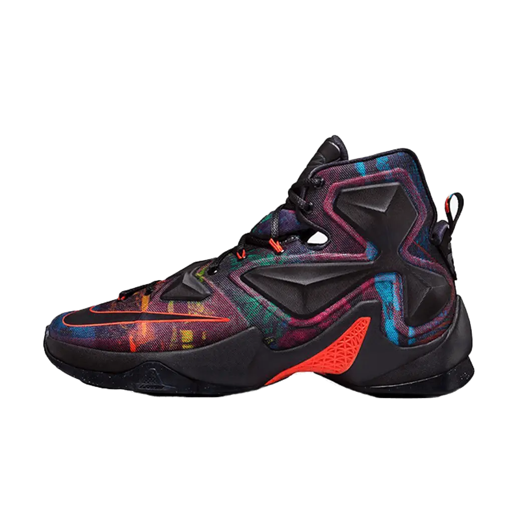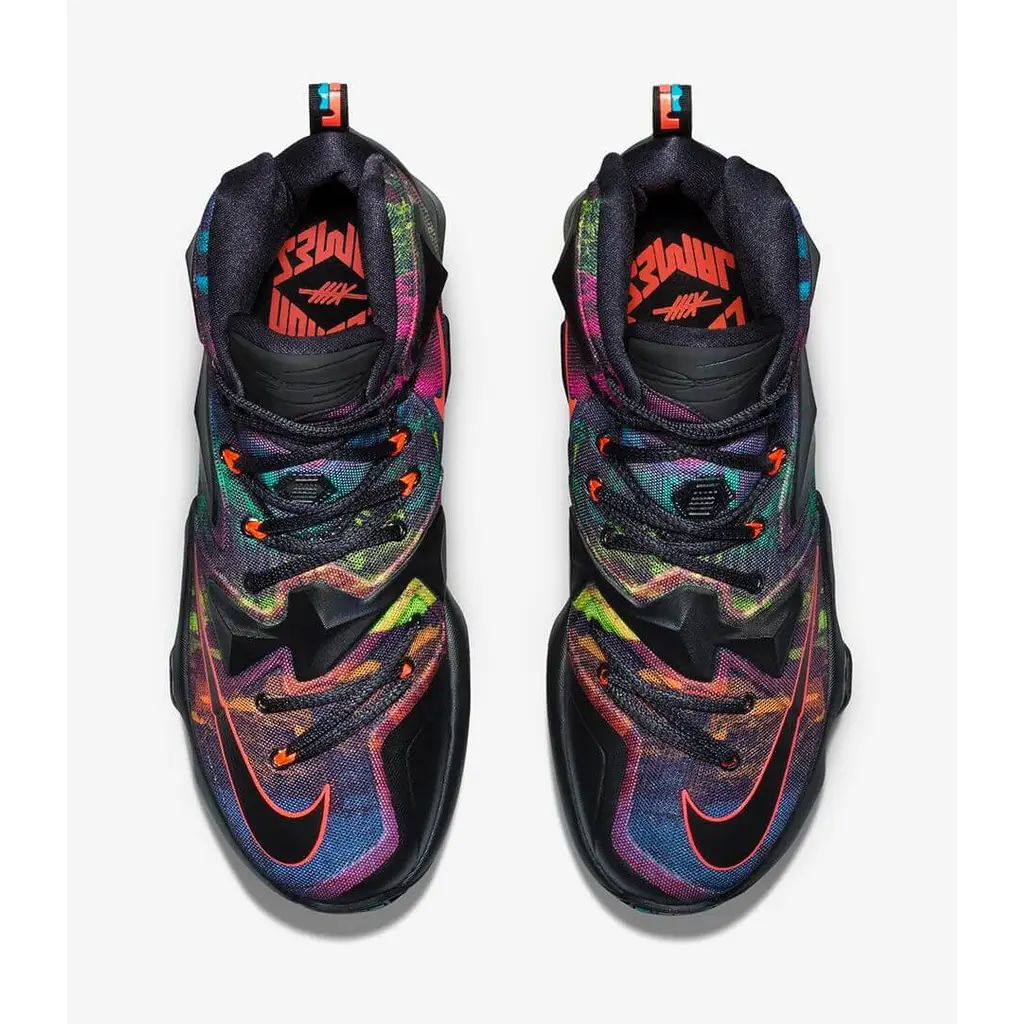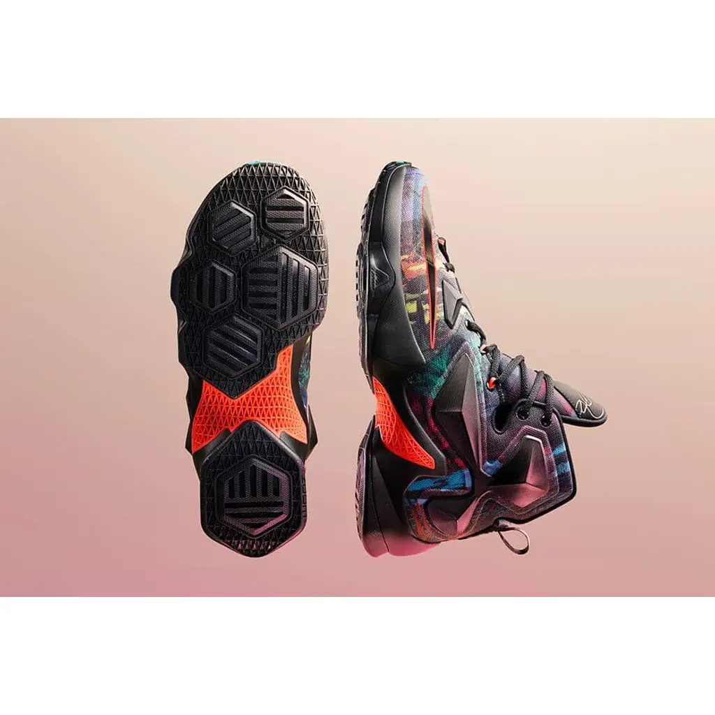 This edition of the LeBron XIII is highlighted in a mix of Black, Hyper Orange and Blue Lagoon colourway with multicoloured splatter covering it. In the graphical upper, the wheat field resembles his home town of Akron and the abstract palm trees pay homage to his championships in Miami. There are orange hits on the swoosh branding and midsole. There is more branding on the tongue, heel and pull tab. A speckled black outsole completes the overall look. We have seen a lot of basketball shoes over the past few months but this pair has something different about it which makes it a great one.