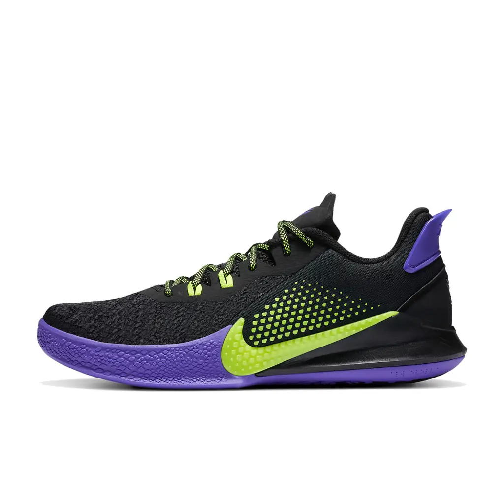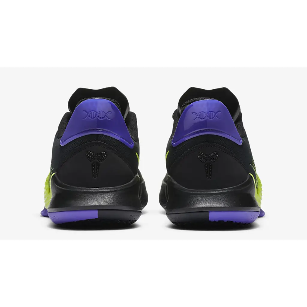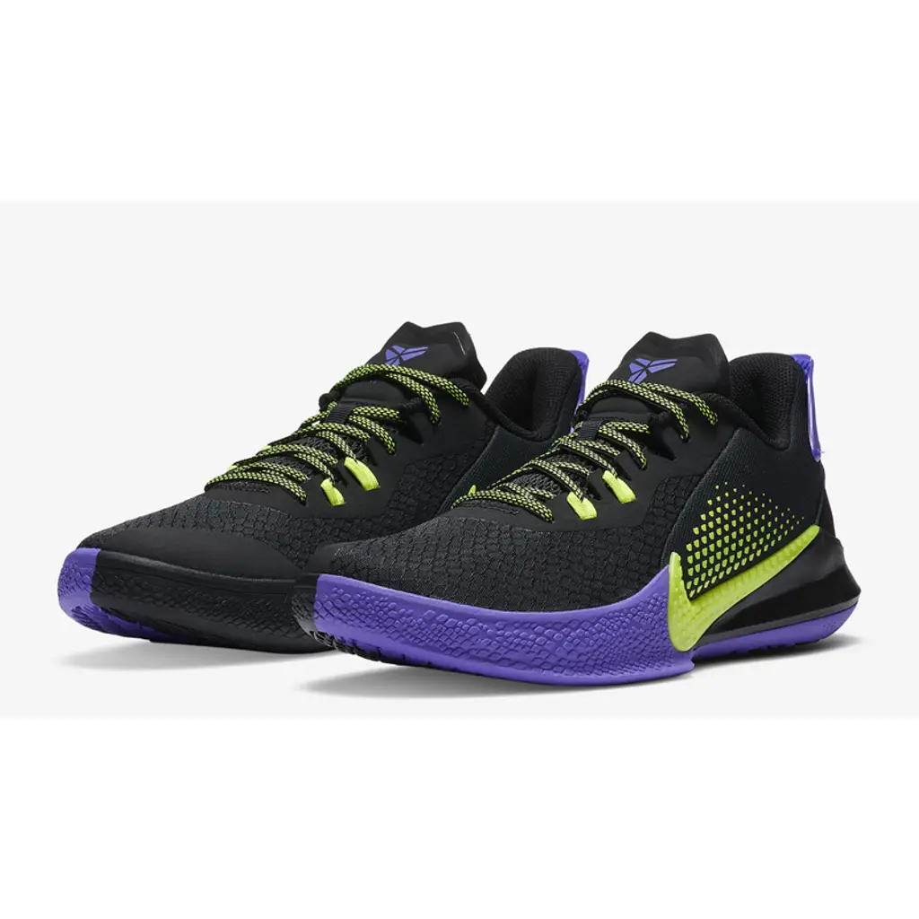 Paying homage to the Los Angeles Lakers Away colours, the Nike Mamba Fury Black comes in a stark black upper with regal purple accents at the heel tab, Kobe branding on the tongue and a ying-yang style black rubber outsole. Hits of lemon venom adorn the laces, the textured scale pattern Swoosh along and the undertone on the medial side of the shoe.