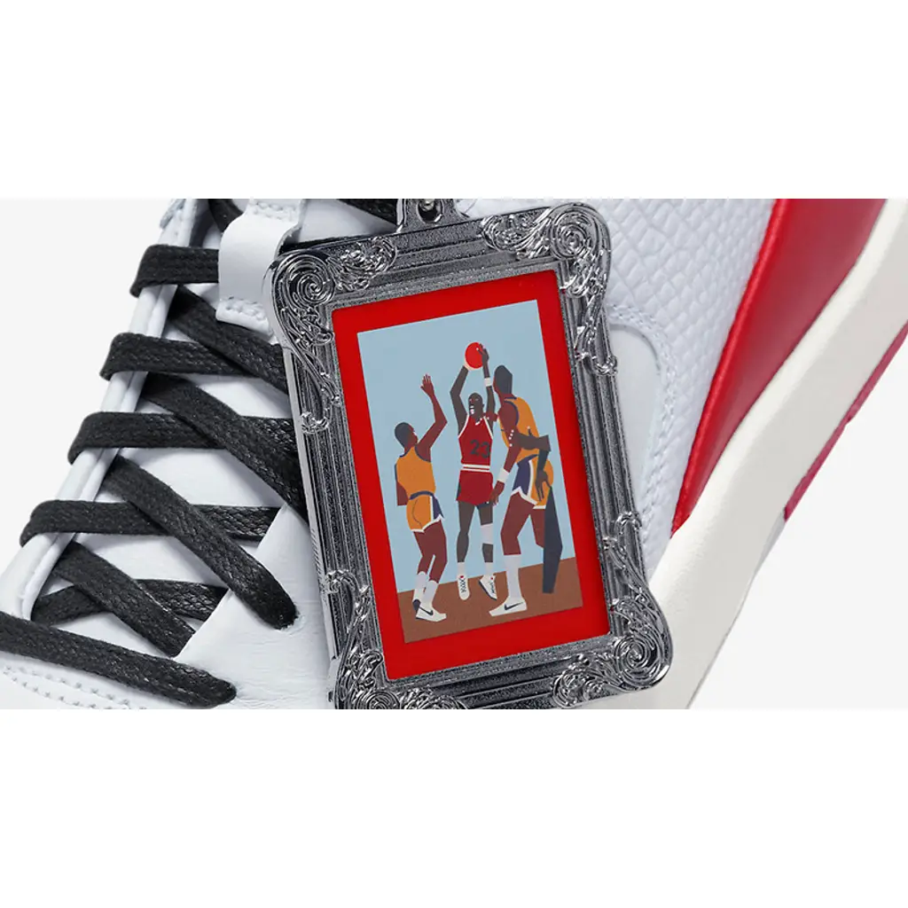 The highly malleable AJ2 silhouette is the perfect canvas for Abney. The shoe’s upper has a smooth white leather base with a light grey suede toe cap and a riveting triangular quarter panel with a glossy white snakeskin finish. The extended heel panels which form a wedge design on the lateral and medial profiles of the shoe are made from striking red smooth leather. The midsoles of the sneaker are Sail-coloured while the outsole is a combination of white and red sections. Completing the design of the shoe is an oversized framed hangtag of Abney’s basketball-themed art and the artist’s name printed in black on the red insole.