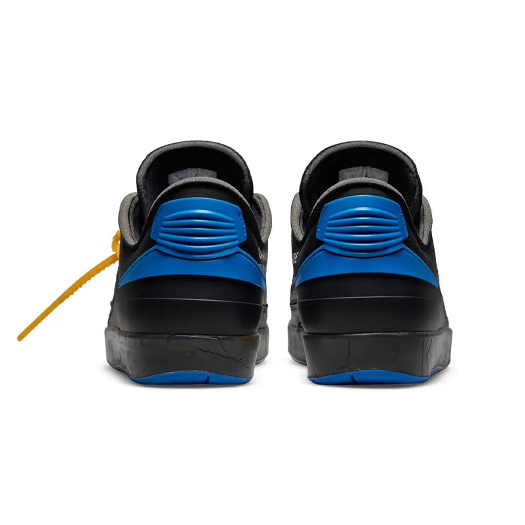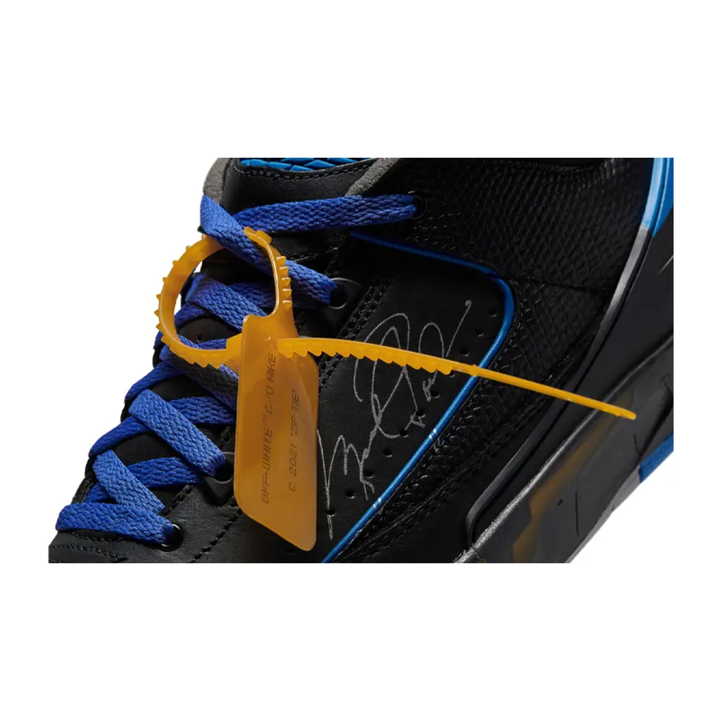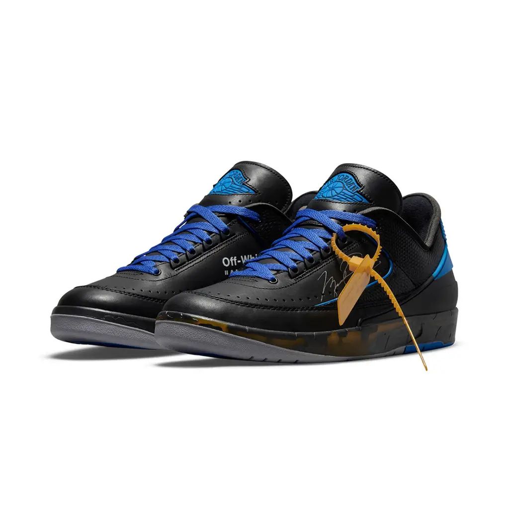 This low-top profile sees a mix of premium materials across the upper in black while a Royal Blue tone delivers a pop of contrast on the tongue’s Wings motif, shoelaces, and rear TPU caps. Off-White’s signature zip ties and technical verbiage on the medial sidewalls, and the pre-aged cracked Air midsole underfoot complete this co-branded AJ2s.