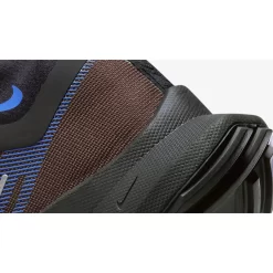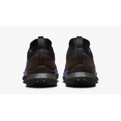 This Pegasus Trail 4 features a taller, more protective collar with a gaiter to keep out debris and water and waterproof, breathable GORE-TEX lining. The woven mesh upper is mostly brown blue accents in the form of GORE-TEX branding on the lateral forefoot, a stylised Swoosh on the lateral mid-panel made up of slanted lines and a reverse Swoosh on the lateral collar. Large GORE-TEX branding in orange can be seen on the medial mid-panel. A React technology-enhanced black and blue midsole and a black outsole with generative traction and grippy rubber nubs finish off the design of this shoe.