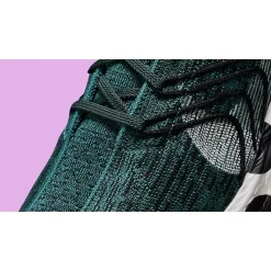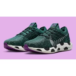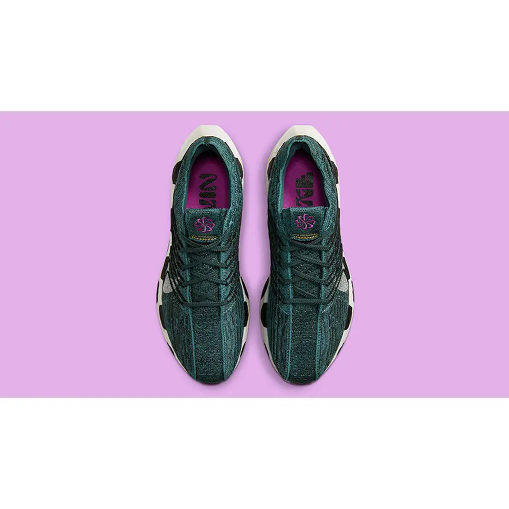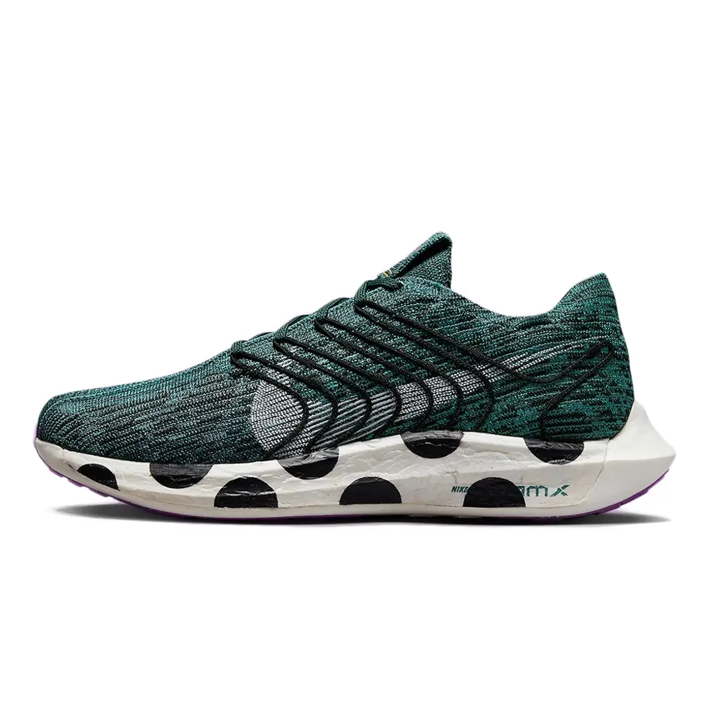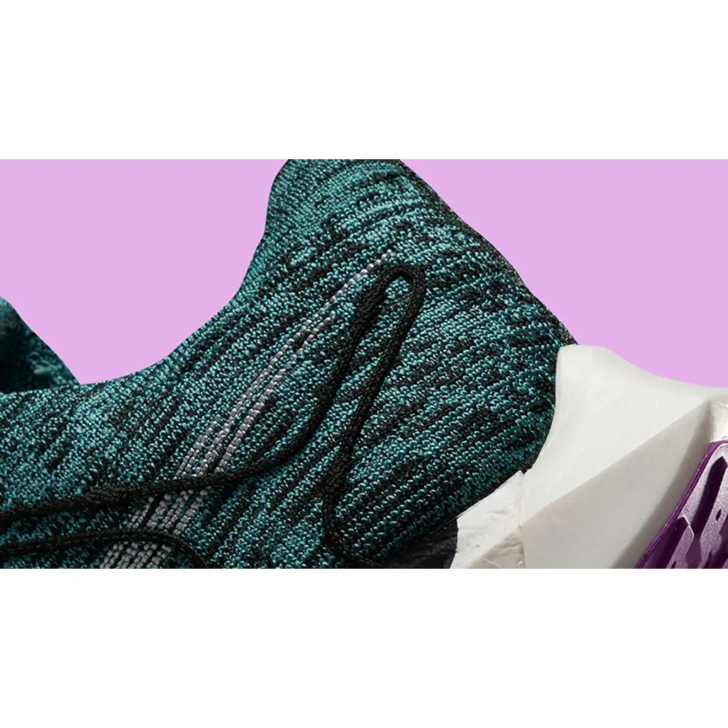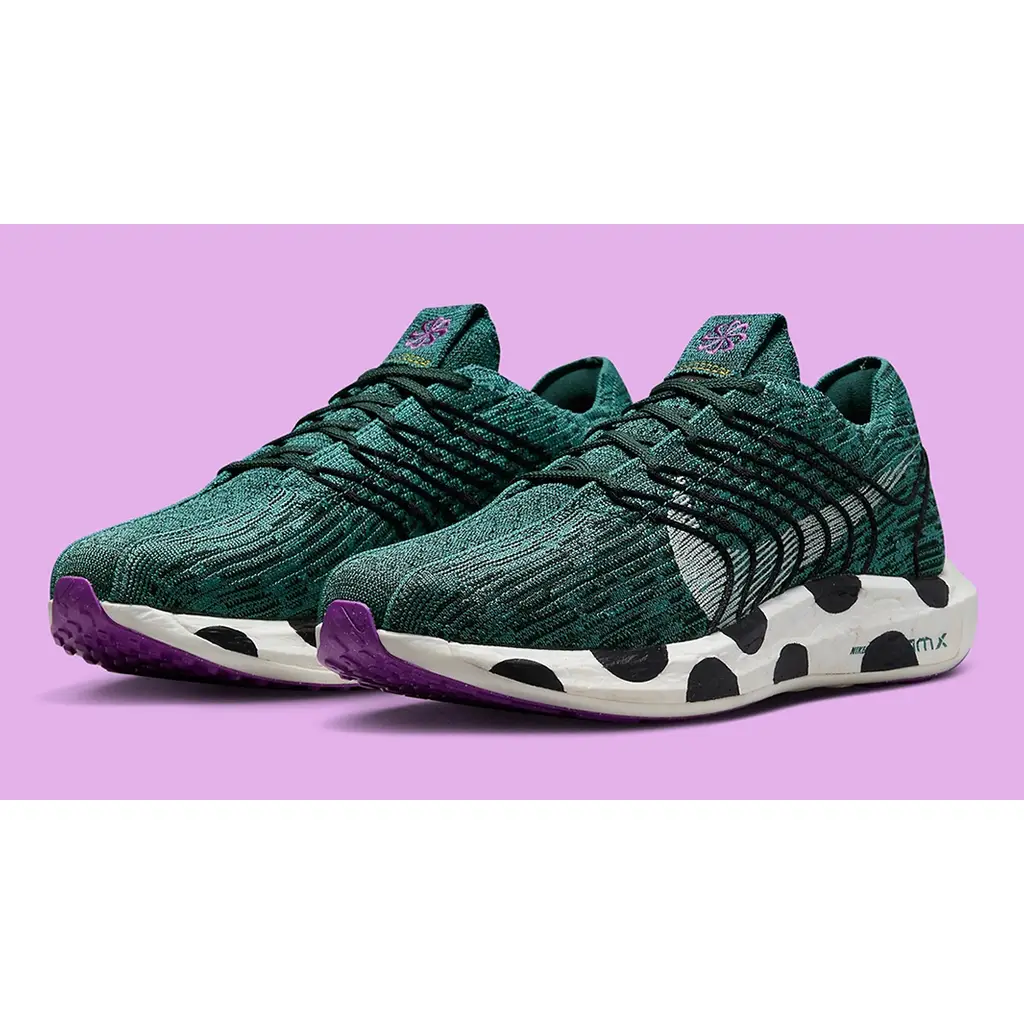 This sustainably-constructed Pegasus Turbo has a Flyknit upper that is made up of 100% recycled teal-green, black and white yarn that still provides utmost breathability and comfort to the wearer. White profile Swooshes are woven into the design of the upper on the lateral side. A modified eye stay system is also woven into both sides of the shoe, creating a zig zag pattern in black. The most striking part of the shoe, though, is the white ZoomX-enhanced foam midsole made in part with upcycled material featuring a bold polka dot design. Purple Pinwheel “Move to Zero” branding on the tongue and a speckled purple rubber outsole wrap up the style of these kicks.