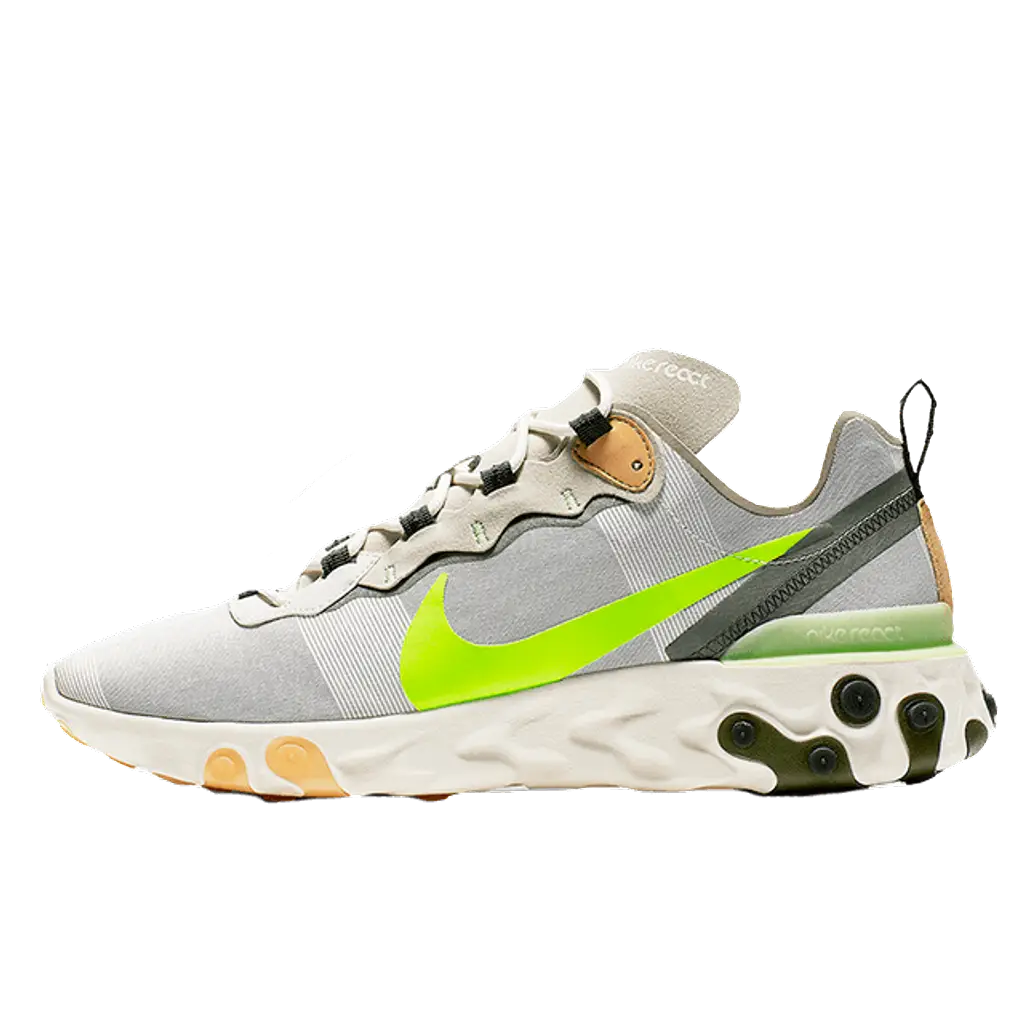 Lightweight and premium nylon covers the upper of the React Element 55. This shoe sports of deep shade of beige across the upper which extends onto the tongue and lace surround. Elasticated panels add support and make these especially adaptive.