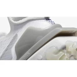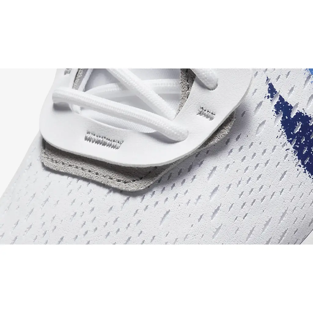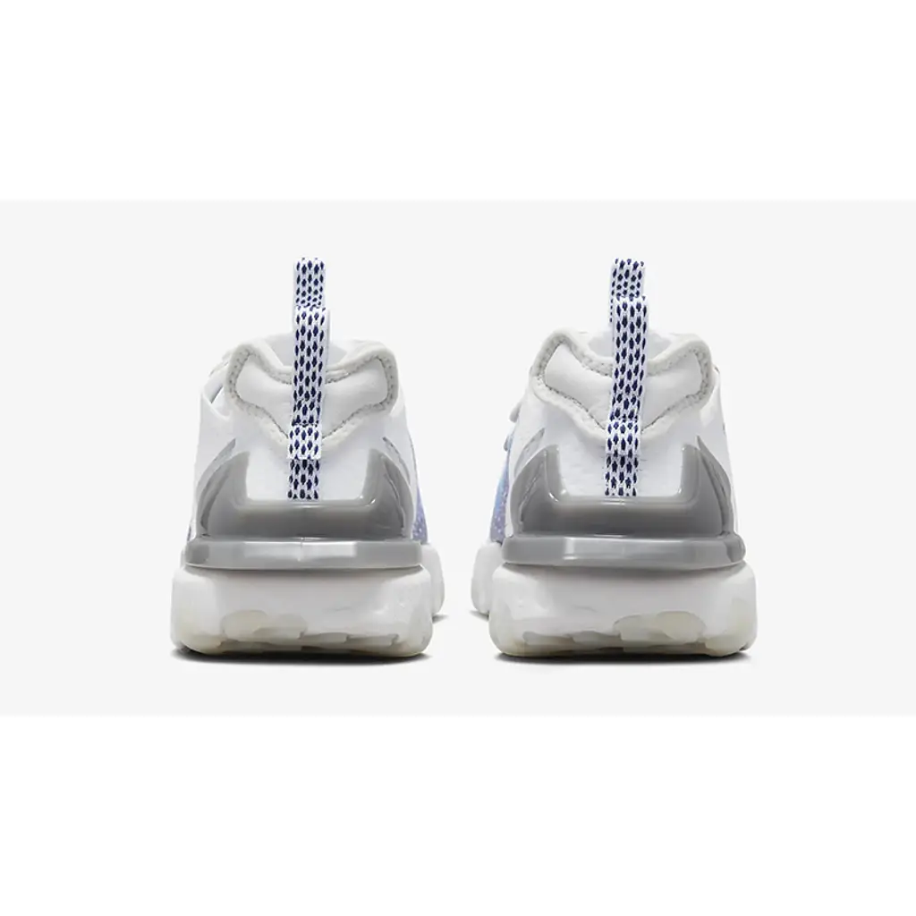 Nike React foam came out as early as 2017 but didn’t live up to people’s expectations. Everything changed when Nike launched the Nike React Element 87 and 55 models. Following in their footsteps, the Nike React Vision flexes a chunky full-length React foam sole unit. This style features a white breathable mesh base with suede overlays surrounding the eyestays. A grey plastic heel counter keeps the aesthetics clean. Two spray paint Swoosh logos on the lateral and medial sides appear with different tones of blue.