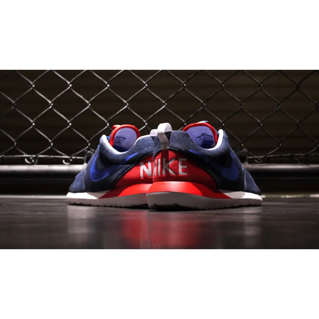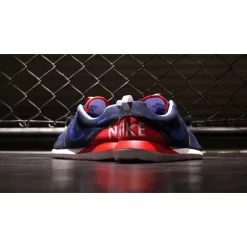 It features a navy heather upper with hits of Gym Royal on the swoosh and a University Red heel cup.