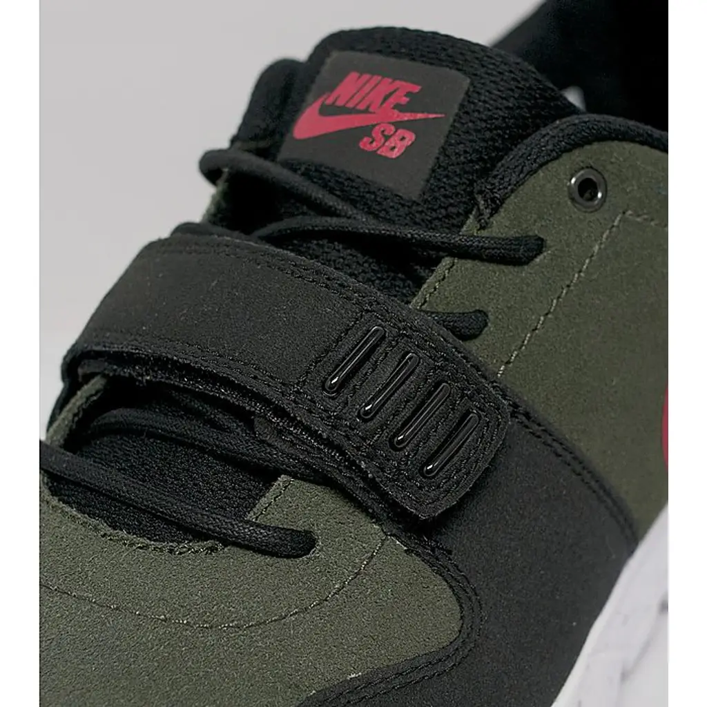 The upper here features a dark green soft suede with a gym red Swoosh symbol on the side. You can also find the gym red detailing on the Nike SB tongue logo.
