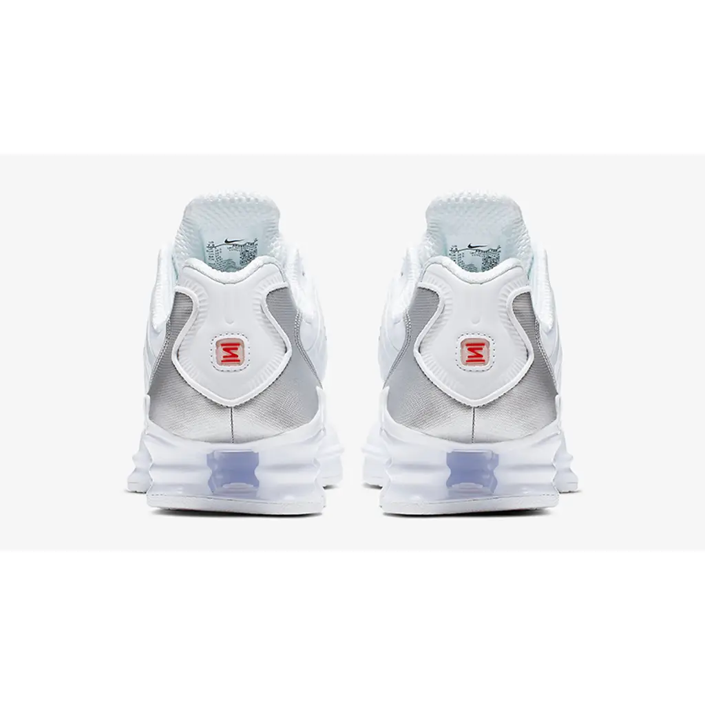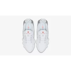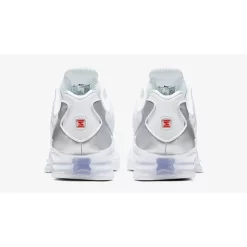 Nike branding is on the sidewalls in silver outlined aesthetics, matching up with the heel panel, as well as a red Shox logo on both the tongue and heel.