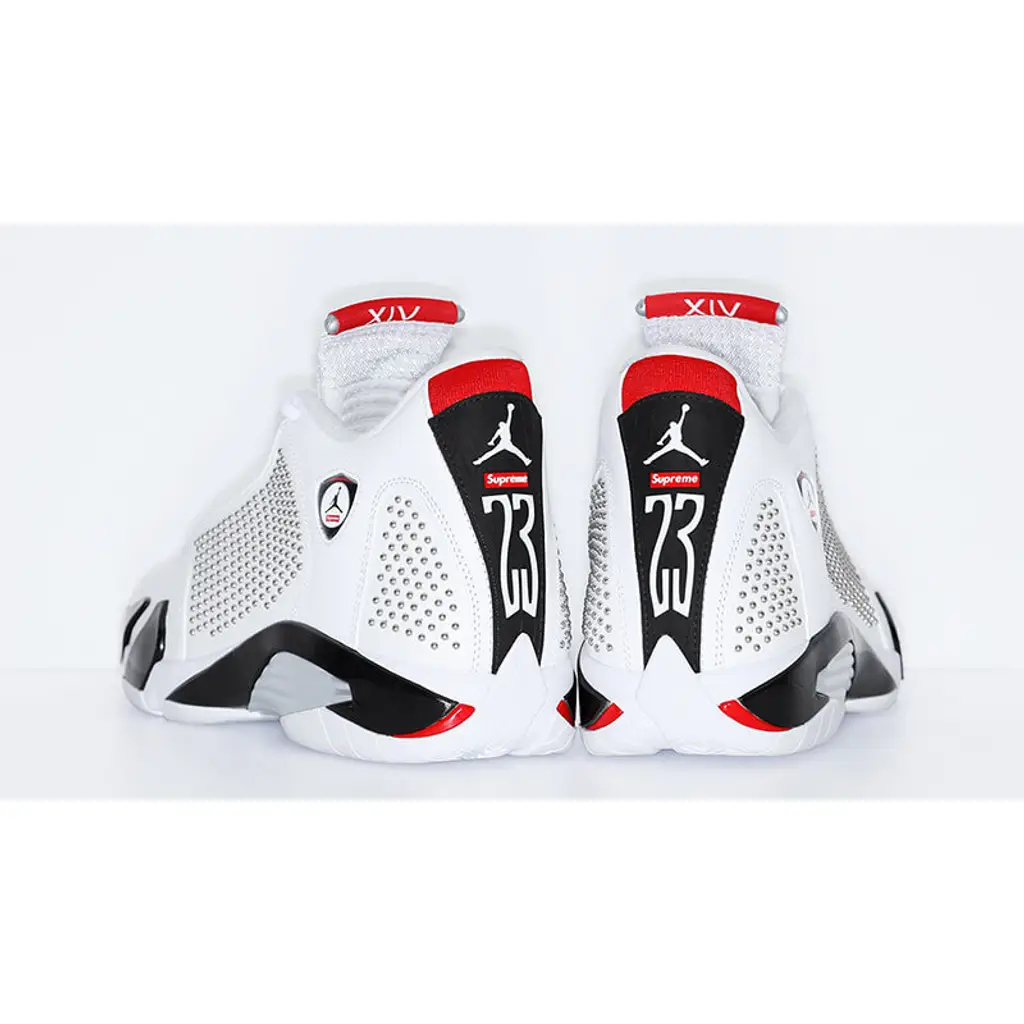 Giving the last shoe Michael Jordan wore as part of the Bulls a total rework, the Supreme x Air Jordan 14 White works on an ultra clean white base that’s crafted from premium tumbled leather. Stealthy black accents feature on the midsole for an aggressive look, and striking red hues hit the collar, complete with Supreme branding. Hundreds of little metals studs grace the lateral and medial side panels, giving the basketball silhouette an almost punk-rock aesthetic.