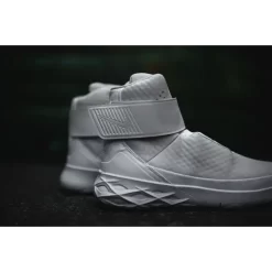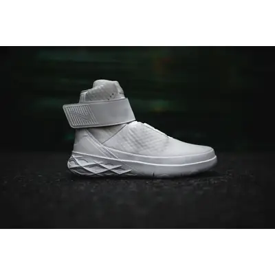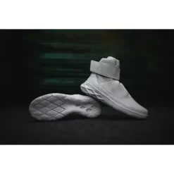 The upper is crafted with soft, premium leather in a full monochromatic colourway. The laceless design is made possible with the addition of a chunky, midfoot strap which gives that snug, lockdown fit. Other notable features include the diamond patterned midsole which adds a stand-out element to an otherwise subtle pair of sneaks. Small logos are stamped on the strap and tongue which also glow in the dark.