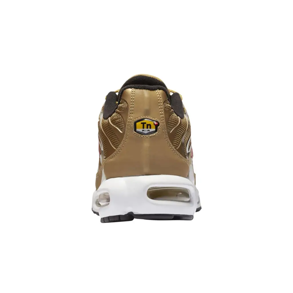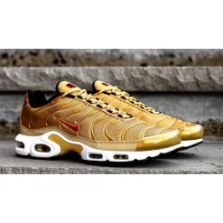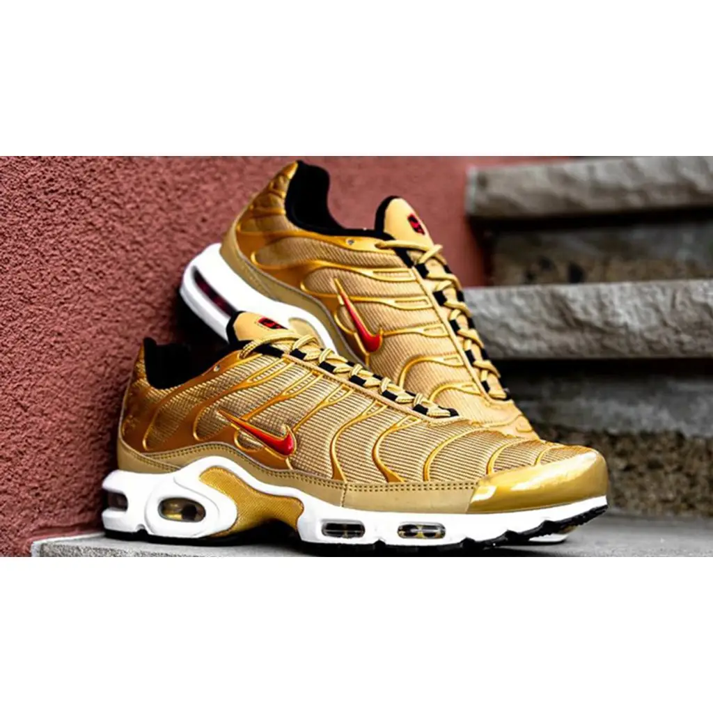 Gold hues throughout the upper transform this staple sporty silhouette from a tracksuit accessory into a gleaming, bold companion for your streetwear fit. A gold leather overlay dresses the heel section with the classic TN Air plate stitched on, leading down to the Air unit built into the midsole for a cushioned feel. The Swoosh branding arrives in a bold red to contrast against the golden background appearing on the tongue and body. As gold laces scale the throat to allow you to create the ultimate fit, black eyelets stand out atop the gold piping. Beige leather mudguards surround around the midsole and shimmering-gold toe cap enhance that sporty, streamlined aesthetic of the AM Plus.