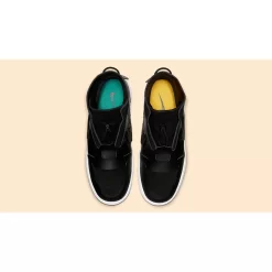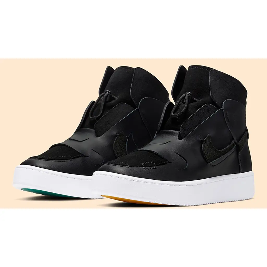 Black leather and suede cover the upper, in a futuristic style with elasticated lace detailing giving an even more stripped back look to the High Top Vandalised LX Nike silhouette. Subtle Nike branding is then debossed into the heel of the sneaker, letting the shoe do all the talking, finished off with the split Swoosh branding on the sidewalls, in a mix of suede and smooth leather.