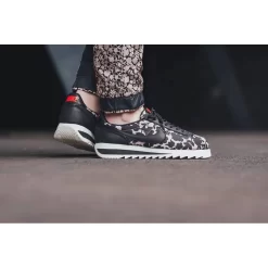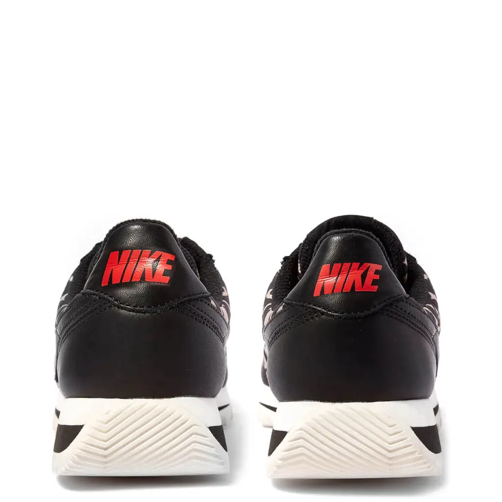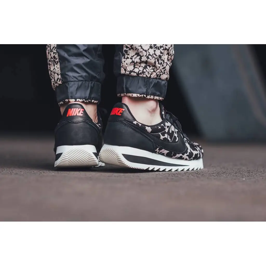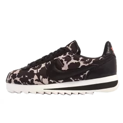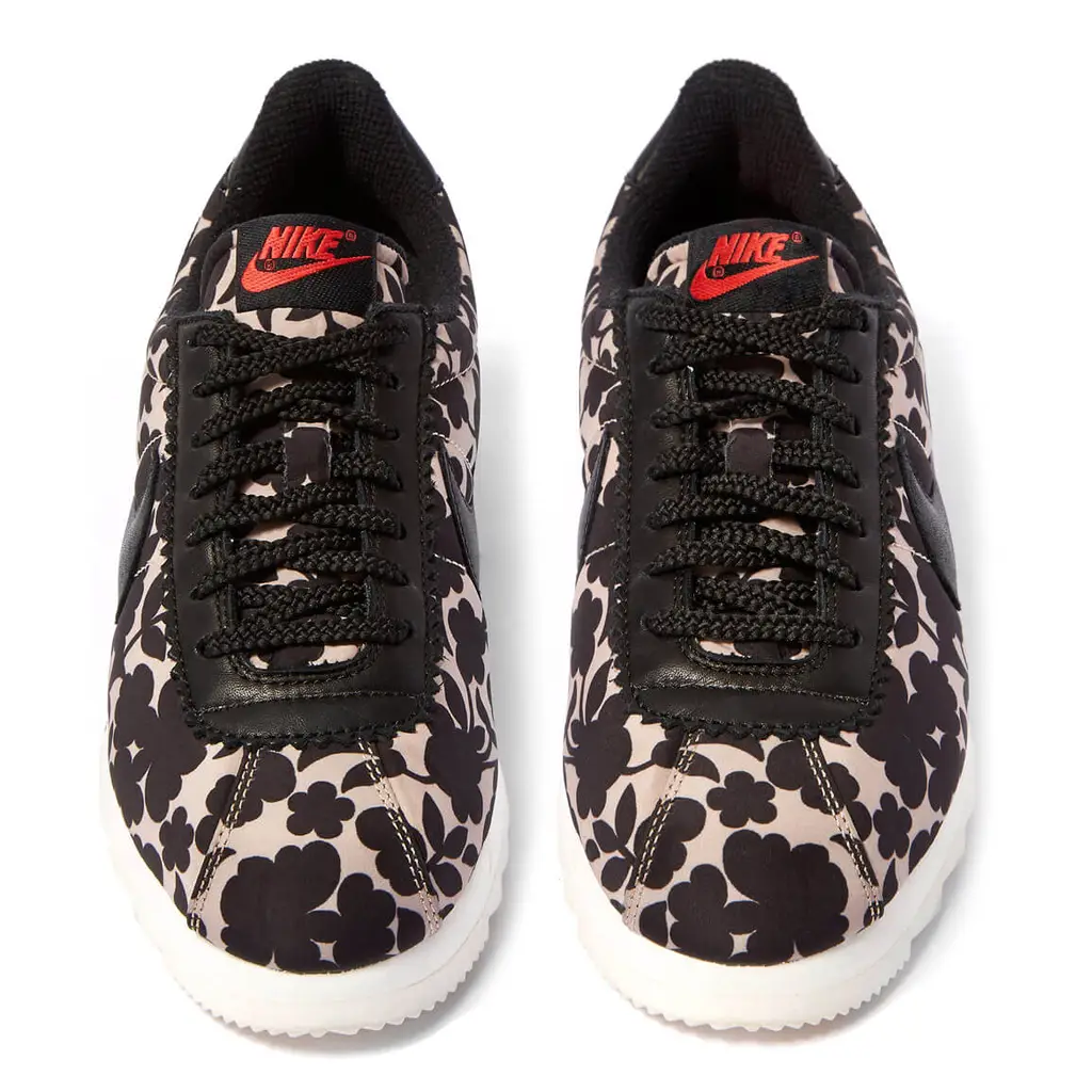 This edition of the Classic Cortez is dressed in a black and tan combined colourway. The pair features a premium leather upper in a flower print with a black back heel. There is large black Swoosh logo branding on the sides and the shoe sits on top of a full-length EVA foam midsole, which adds a thick layer of padding for extra comfort. It also has additional Nike branding on the tongue and back heel region. The pair is finished off with a herringbone pattern moulded rubber outsole.