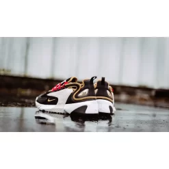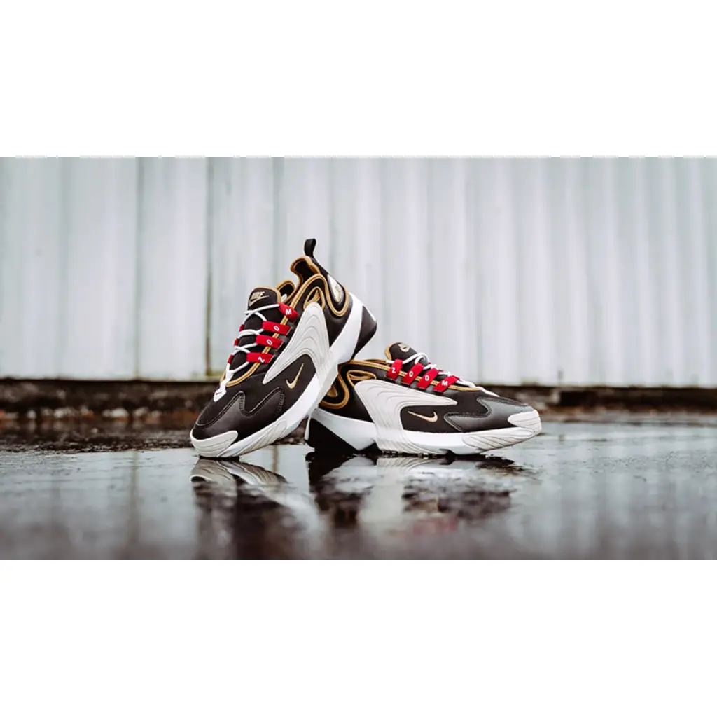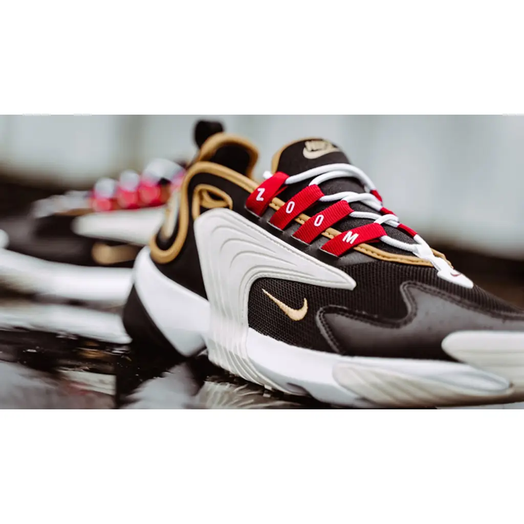 This sneaker adds a contemporary feel to the retro style silhouette, with its chunky midsole and raised collar. The black mesh upper is contrasted white overlays and accents of bright red across the lace unit. Gold details including a miniature Swoosh and trim around the collar add a premium touch to this black and gold Zoom 2K.