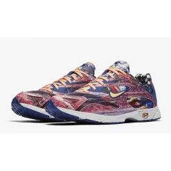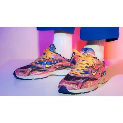 After making a return to market for the first time since 2003 as a Supreme collaboration in June, the Nike Zoom Streak Spectrum Plus Premium Melon has landed, and boy, is it eye catching. Painted in a crazy multicolour style, this chunky sneaker boasts a printed ‘Light Poison Green’ pattern on the mesh underlays, while the leather overlays offer a slew of of different ‘Watermelon’ and ‘Palest Purple’ shades.