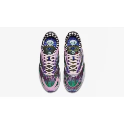 After making a return to market for the first time since 2003 as a Supreme collaboration in June, the Nike Zoom Streak Spectrum Plus Purple has landed, and boy, is it eye catching. Painted in a crazy multicolour style, this chunky sneaker boasts a printed ‘Light Poison Green’ pattern on the mesh underlays, while the leather overlays offer a slew of of different ‘Deep Royal Blue’ and ‘Court Purple’ shades.