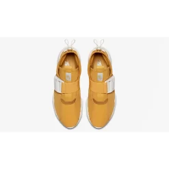 Rip-stop nylon covers the upper in a bright and bold shade of yellow. This is complimented by hits of white which feature to not only the moulded midsole but a chunky strap at the heel and rear.