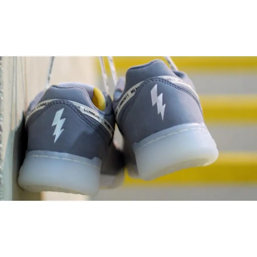 This Offspring variant gives the now-lifestyle model a luxe leather makeover highlighted with Community Member taping around the rear areas, co-branding motifs on the tongue and sidewall logo windows, and Offspring’s signature lightning bolt insignia embroidered on the heel. This design is given a greyscale colour palette contrasted with cream accents.