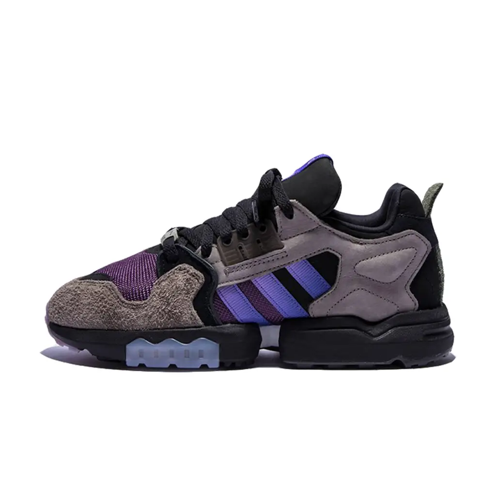 An environmental statement on the impact of pollution, the Packer x adidas Consortium ZX Torsion Green Purple is a darker, more severe sister shoe to the first take on the ZX 9000.