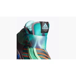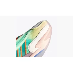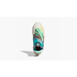 Dual-branding is present throughout, with Pharrell’s signature Hu logo residing on the iridescent ankle strap. Classic adidas branding appears in the form of an embroidered tab on the tongue, and the iconic three stripes are present across each shoe.