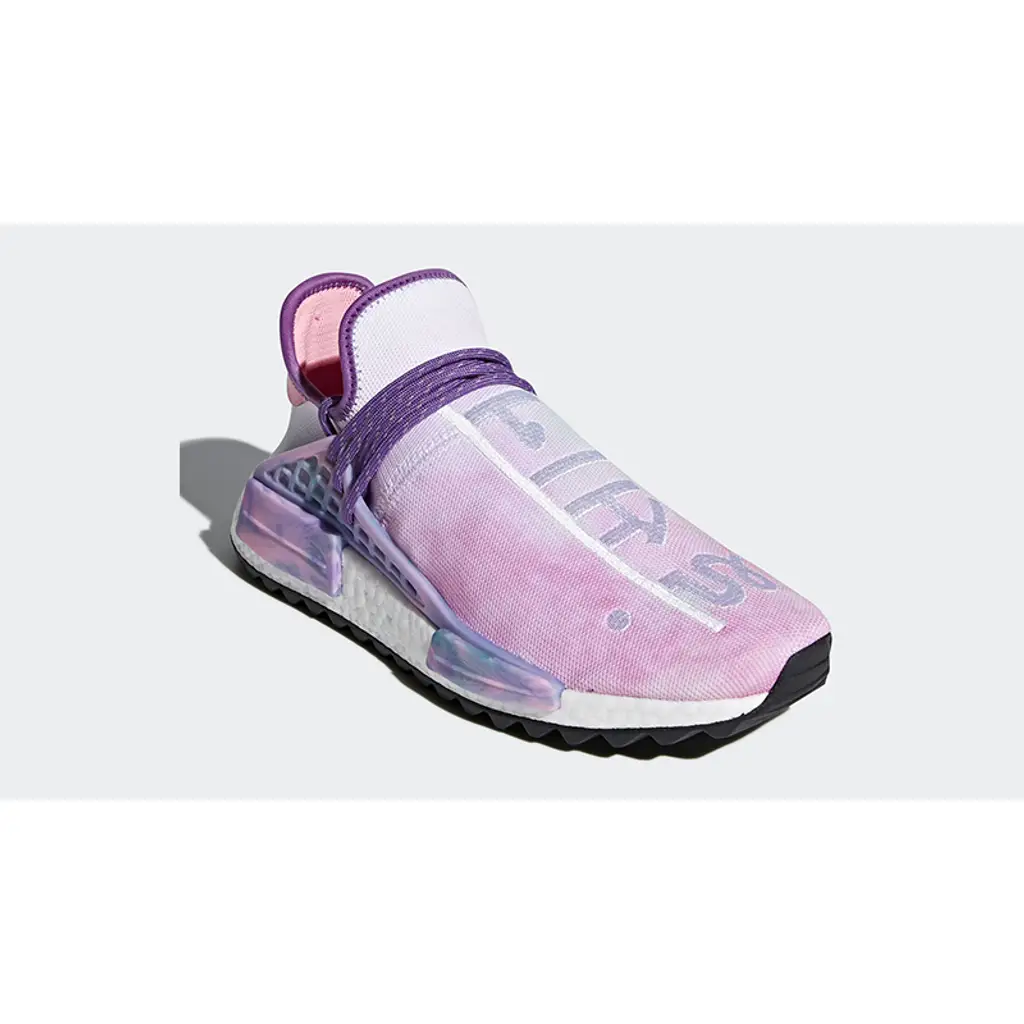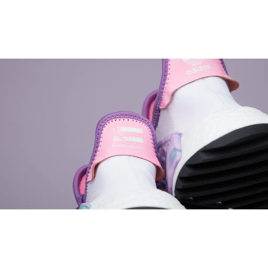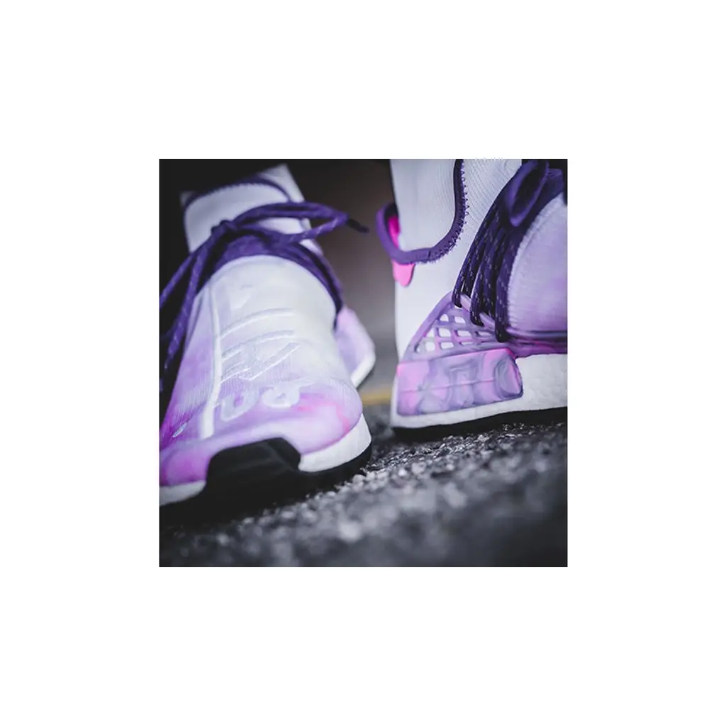 The Pharrell Hu NMD Pink Glow is no exception thanks to the hindu graphics across the forefoot. An acid-wash effect takes form across much of the upper with shades of purple bleeding into pinks and blues. That same theme even features to the EVA midsole plugs which are contrasted by a chunky slab of white Boost.