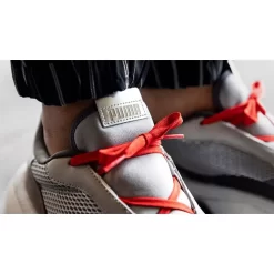Working on an ultra breathable grey mesh base, white leather panels make up the lacing system, while grey suede features around the heel for a touch of luxury. Perfect for the hot summer months, striking red accents make their way to the laces, and down below, an extra chunky midsole is present for additional comfort and a smoother stride, lined with a tough gum rubber outsole that provides wearers with extra traction with every step.