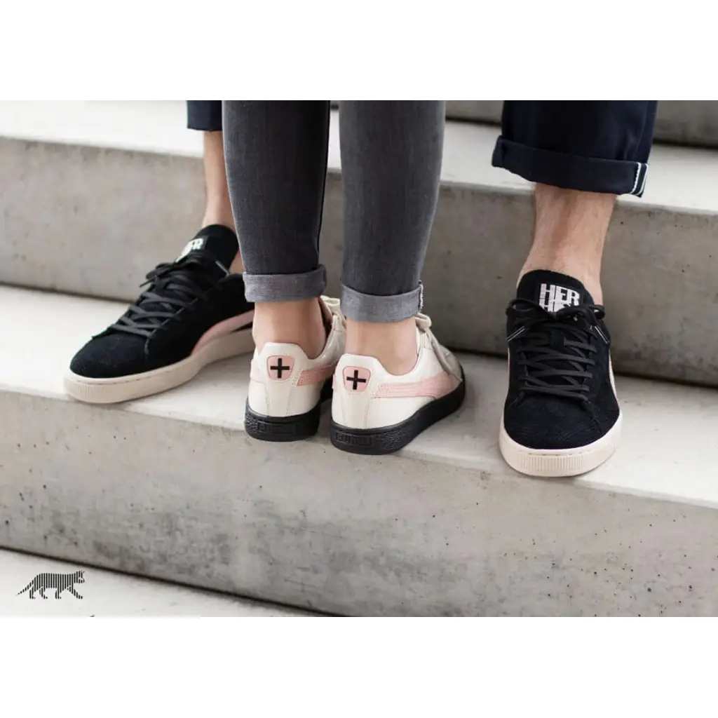 The pair is dressed in a mix of off-white and black colourway. It features a perforated upper which is covered in off-white shade. Just like the His edition, this one also includes light pink hits on the side stripes. The upper is crafted with a perforated suede and features synthetic leather lining in matching colourway. There is the classic PUMA tongue patch which includes with Her&His with an additional symbol on the heel. A black sole unit complete the look.