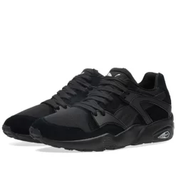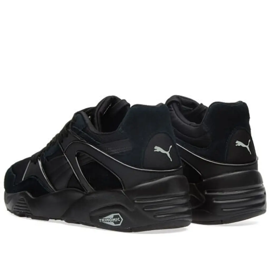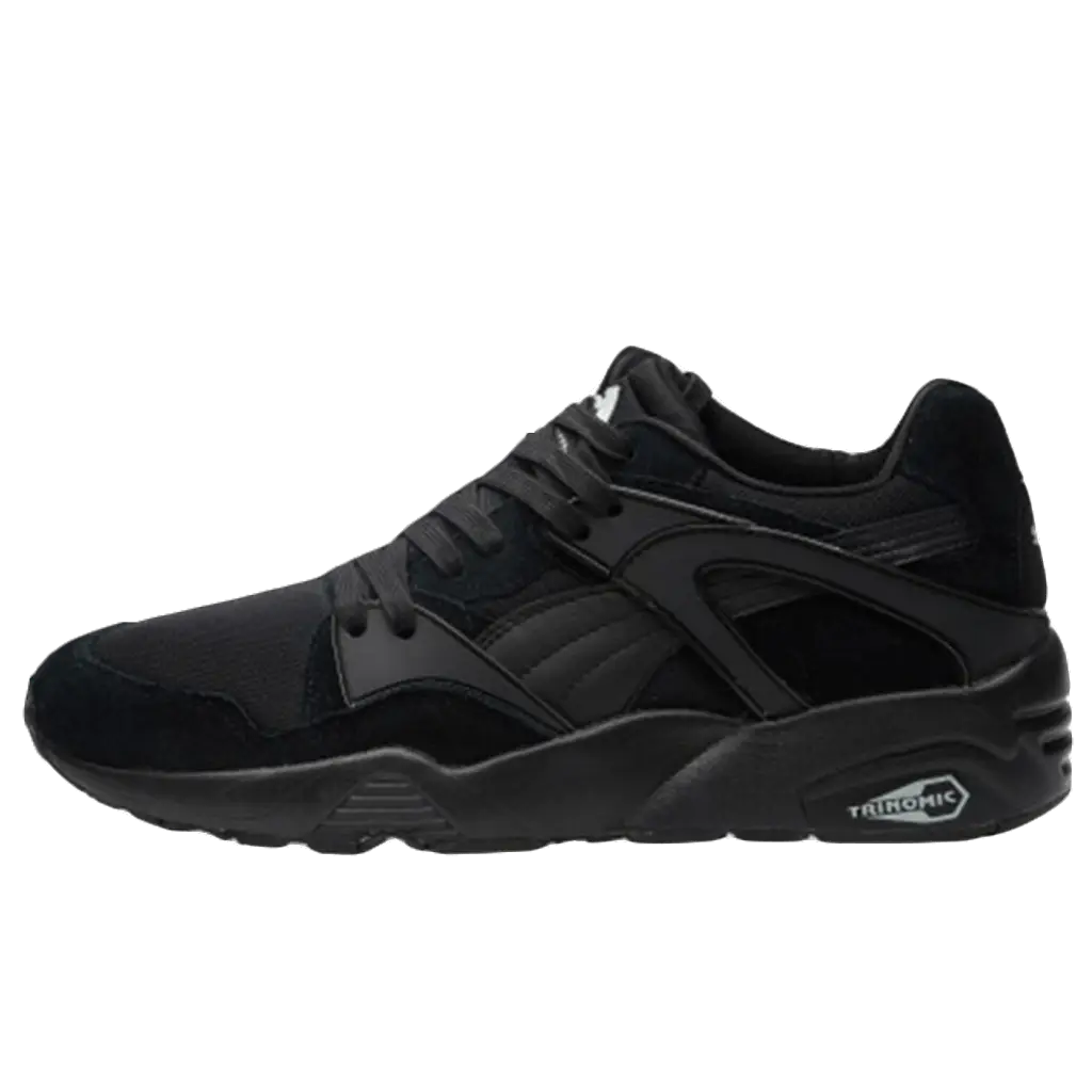 This edition of the PUMA blaze is dressed in an all black colourway. The model features a new construction style that is missing the in-sock liner which is replaced with the brands traditional padded tongue. This allows the wearer to pull on and off the shoe easily. The shoe includes a black-based upper which is crafted from textile and has stabilising TPU fore-foot and mid-foot saddles. There is a matching EVA midsole with the brands proud Trinomic cushioning system which rounds off the design.