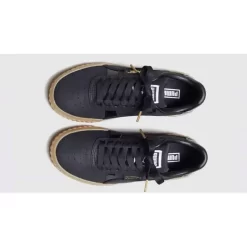 Looking closer in detail at the shoe, we can see perforations around the toe vamp, which bring ventilation and comfort during all-day wear. The Puma Stripe is layered on top of the base layer in black, with tonal stitching enhancing the curved shape. Hits of patent black leather on the heel counter and forefoot bring some glamour to the sneaker and reflecting the light, which only ups the premium nature of the shoe.