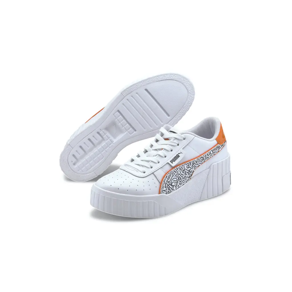 The rest of the shoe has been kept simple with fresh white leather covering the upper, and a pop of orange across the heel. The chunkier, wedge style midsole adds a chic touch to this laid back silhouette, the perfect shoe for a day to night look. Comfort is also assured with mini perforation holes scattered across the toe box, keeping you cool in the heat and the low cut collar. An additional doodle style hangtag arrives attached to the lace unit of this white wedge Cali Sport for an extra design touch.