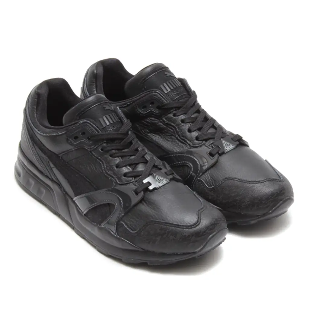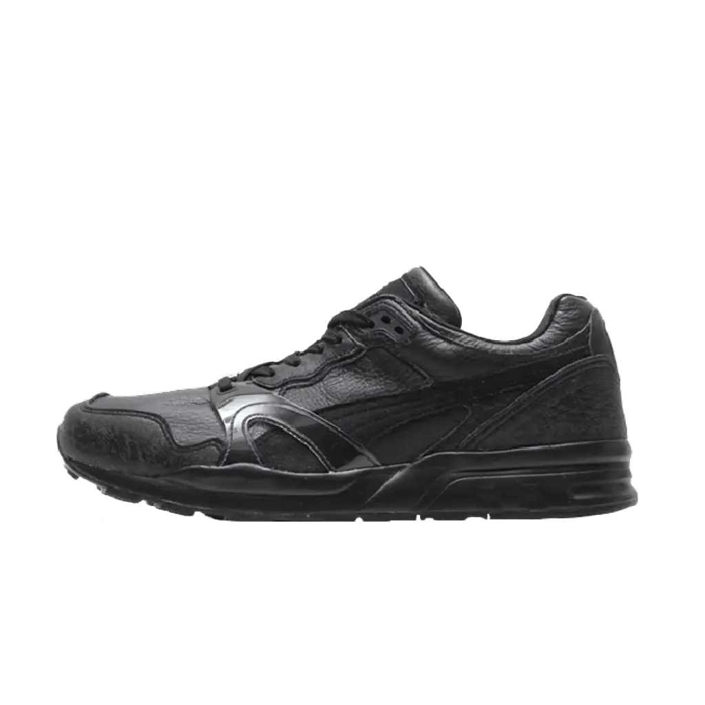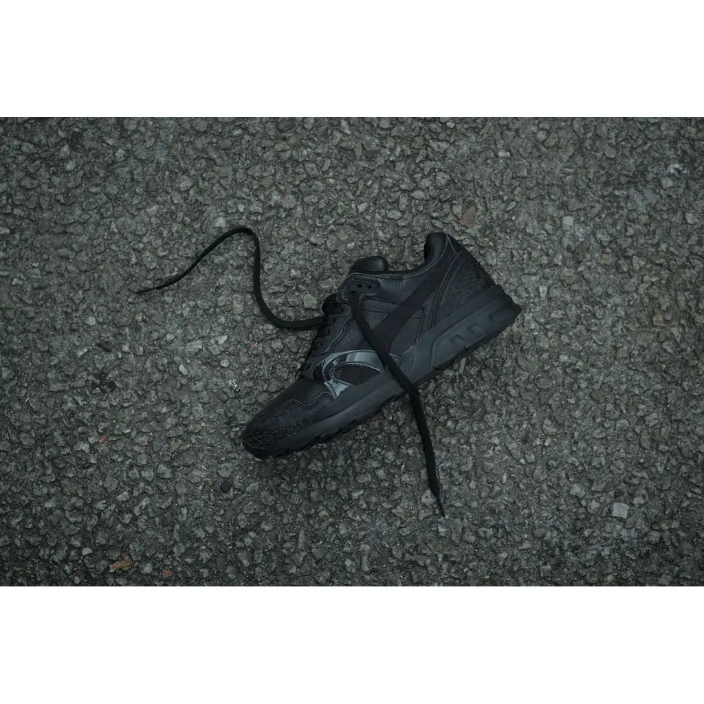 This shoe from the iconic Trinomic silhouette features full black leather upper with subtle suede overlays. The ‘Snow Splatter’ is featured on the toe and heel wraps which give the sneaker a cool, worn in look. To finish this pair, 3m relfective material is utilised which gives an awesome sheen.