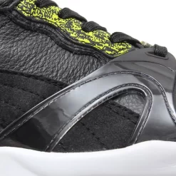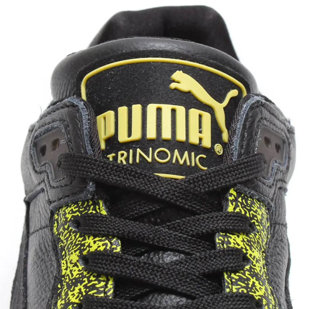 The print is a classy mixture of the splatter plan that was only utilized on the heel counter of the late re-issued Trinomic XS850. The whole upper is black with a bold fluorescent yellow splatter with a Trinomic logo attached ith the back. The whole body is made of new materials from the Trinomic silhouette. It also features the unique Snow Splatter design applied to the toe and heel wraps.