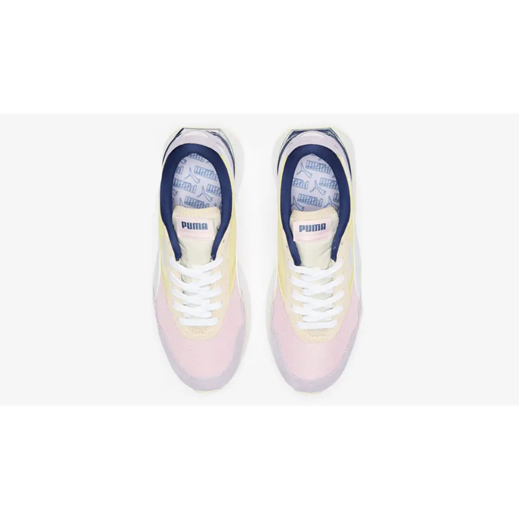 Sat atop a thick white midsole, complete with lemon-yellow detailing, a pink mesh upper comprises the body of this Puma Rider, whilst lilac suede overlays cross the toe and heel. Creating a mixture of textures that add layers and dimensions to this sneaker, a navy-blue panel is attached around the heel, tying in with the colouring around the ankle and the Puma branding on the top of the tongue. White stitched panelling makes its way from the lateral and medial sidewalls round to the heel, whilst a white lace unit is surrounded by a cute, peach suede feature.