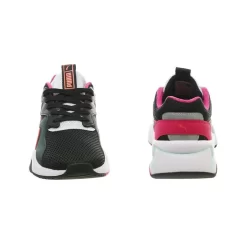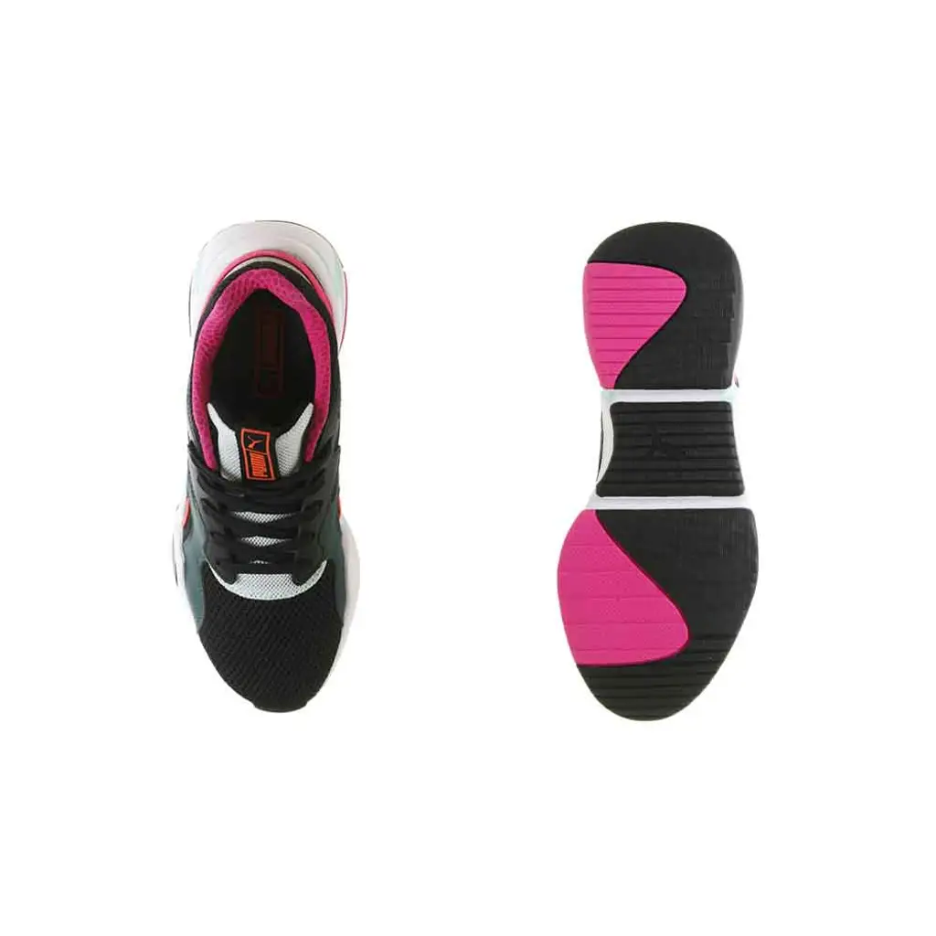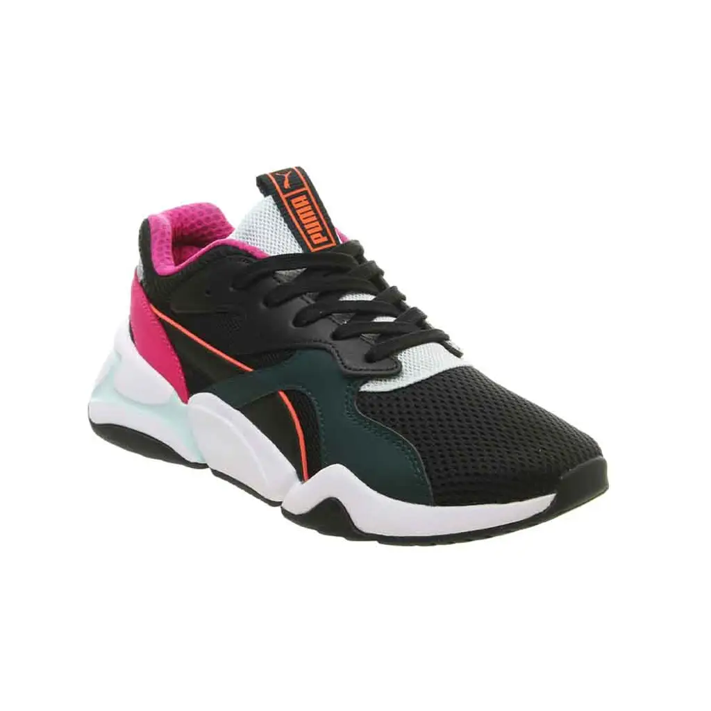 A true 90s throwback, Puma is giving us premium retro aesthetic in this sneaker silhouette. Fashioned from a breathable black mesh upper, you’re sure to feel comfy running around in these all day. Hits of colour come in the form of leather abstract-shaped overlays in a deep forest green, hot pink, grey and a bright orange piping which resembles the Puma Form Stripe.