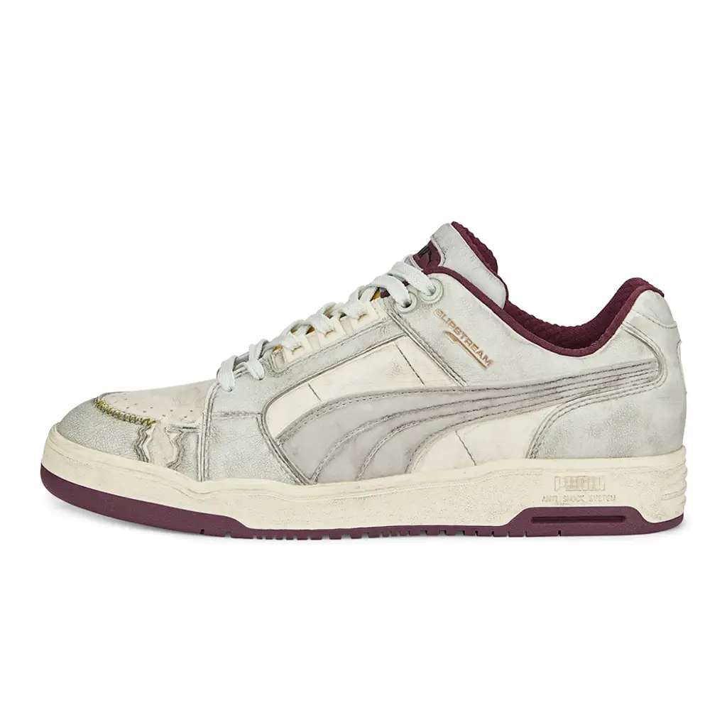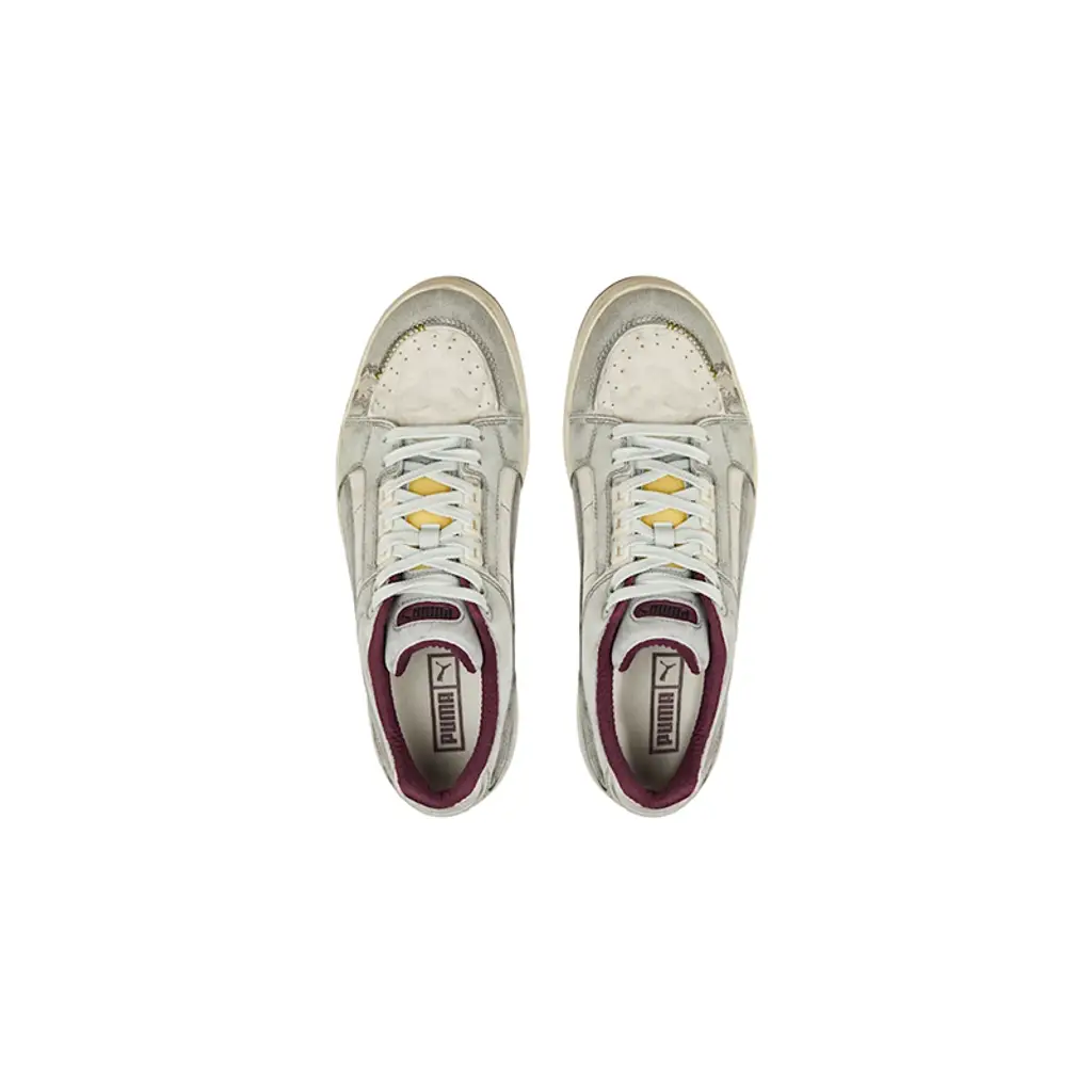 Dating back to 1987, the PUMA Slipstream sneakers are an original take on basketball kicks. This Low Wabi Sabi iteration honours the style’s roots and is presented here in panels of perfectly distressed leather. From the smudged off-white hue to the ripped mudguard and textured leather outer: everything about this design is intentional, so you’ll have less work wearing it in. Contrasting hits of burgundy enter via the lining, rubber outsoles and tongue. The latter is even panelled with a bright-yellow sponge insert beneath the lace-up fastening on a final deconstructed note.