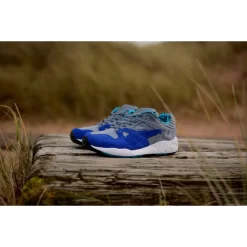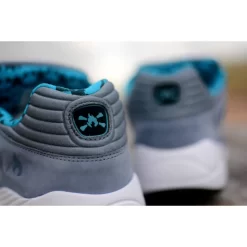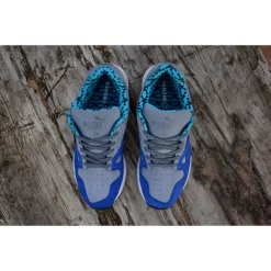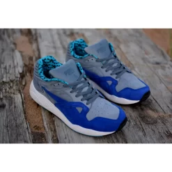 This edition of the PUMA XS850 is dressed in a mix of blue, grey and black fused colourway. It references Hanons skate beginnings and includes a nice looking rich nubuck upper. The frontal region of the shoe is highlighted in blue with a contrasting grey rear end. There is a Flame n Bones multi-print branding on the collar lining and footbed. A white midsole and a multicoloured outsole complete the overall look.