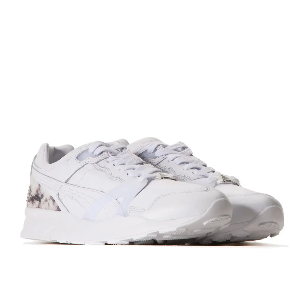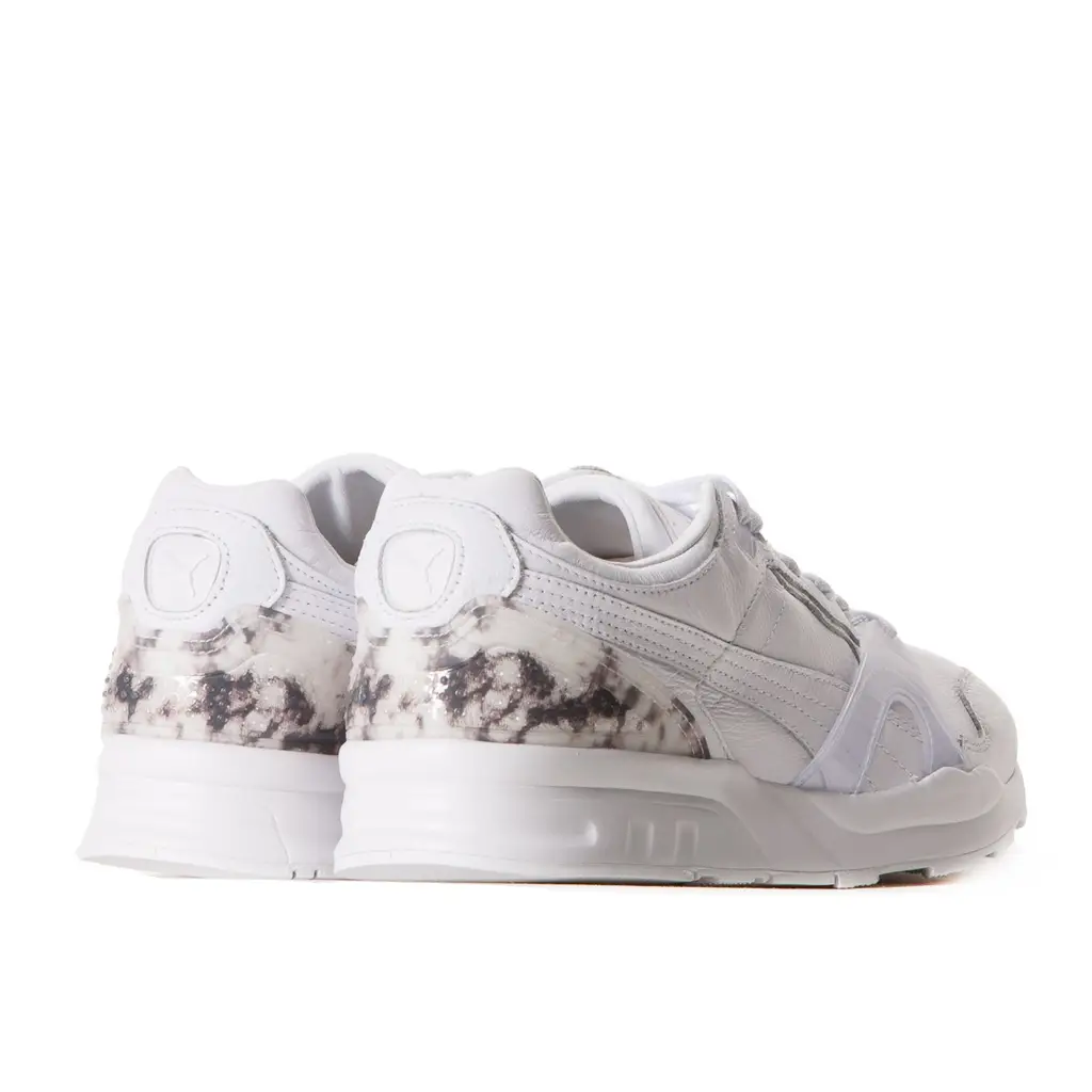 This pair of Puma XT2+ is crafted with white premium leather. It includes synthetic see-through panels on the front region. There is off white and black marble pattern on the heel area. The shoe is finished with a pair of white laces and a very comfy white sole unit.