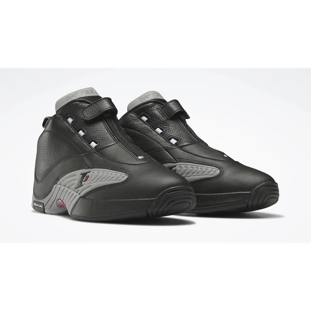 After a lengthy absence, the famous supple Answer 4 leather sneaker is back with a predominantly black upper. Shades of Rivet Grey can be found on the tongue and the DMX cushioning system. Red details are scattered across the tongue tab, midfoot shank and the “3” in Iverson’s logo. Crisp white lace accents peek out of the zip-up tongue closure, while the covered laces are highlighted in a crisp white hue. A black and Rivet Grey sole unit and Iverson’s “Only the Strong Survive” motto on the insole and outsole complete the design of this shoe.