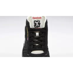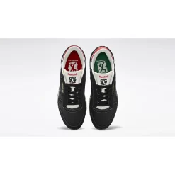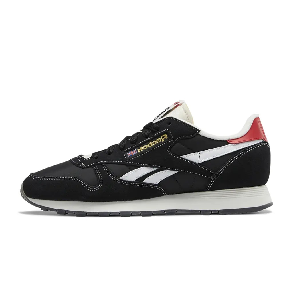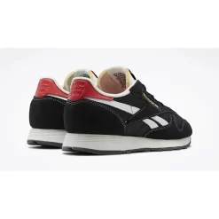 Style-wise, this Reebok Classic Leather has a smooth black upper and matching suede overlays. Contrasting the dark background is the Reebok logo on the side panels. The Reebok branding itself stands out with its metallic gold colouring. Elsewhere, the red heel overlay adds a punchy twist. This sneaker finishes with a removable EVA sockliner, a white EVA midsole and a durable rubber outsole.