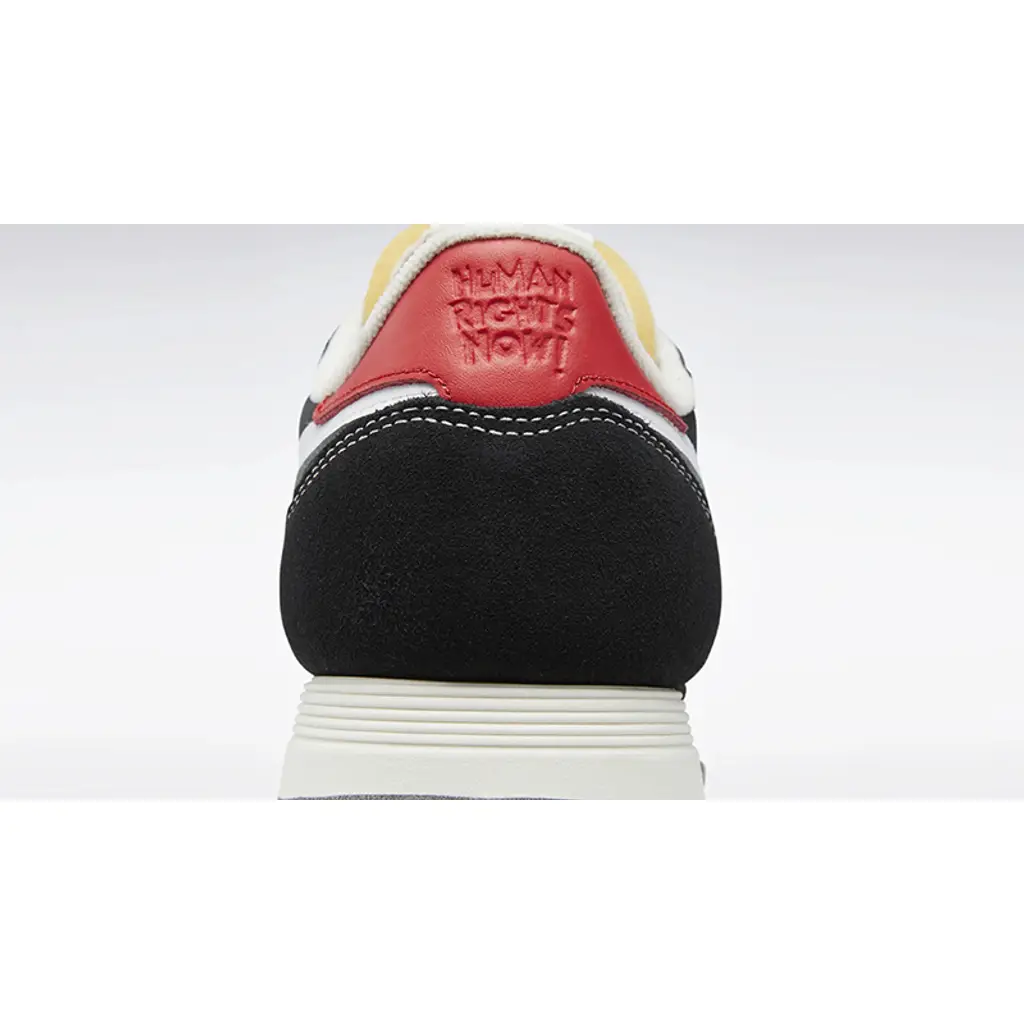 More than a sleek shoe, the Reebok Classic Leather Human Rights Now! Black is designed to bring awareness to human rights issues. The lightweight white tongue is branded with the Human Rights Now! logo. On the back, the Human Rights Now! Manifesto is printed. It reads, “Let your voice be heard, wear this product with pride. Not just because you support the fight for human rights, but because you have those rights.”