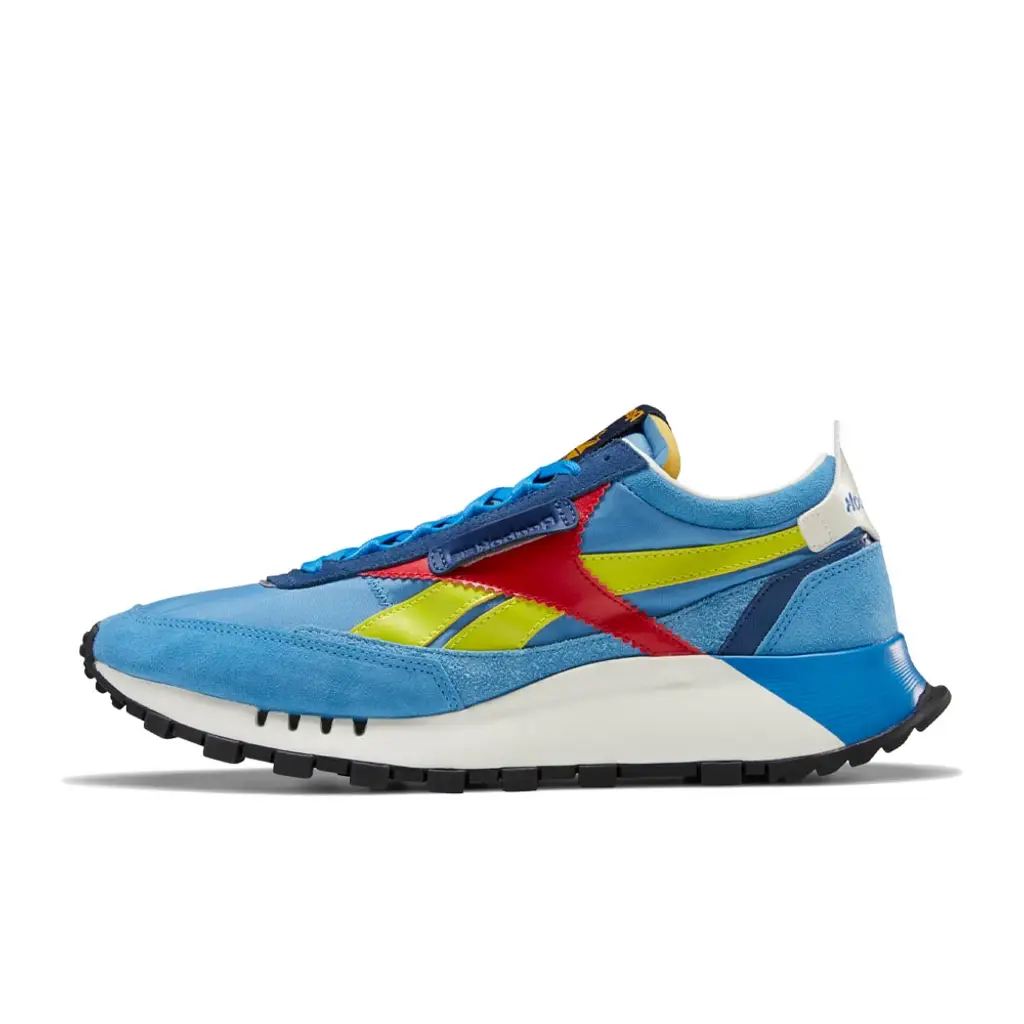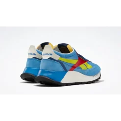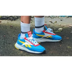 The Reebok Classic Legacy Spital Blue shoe takes its inspiration from these vintage runners and has upper features comprised of bold blue leather, textile and suede overlays. Things like shots of red and yellow give these sneakers extra standout appeal while contrast side stripes help the leather upper stand out.