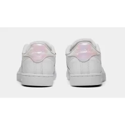The silhouette is crafted from multiple layers of smooth whiter leather for the upper, with tonal stitching running across the shoe for a classic court shoe look. The standout part to this sneaker is the white iridescent panel on the heel counter, which gives a holographic, futuristic aesthetic. We can see flecks of pink, yellow and white in this iridescent patch, which brings some colour to this otherwise monochrome silhouette.