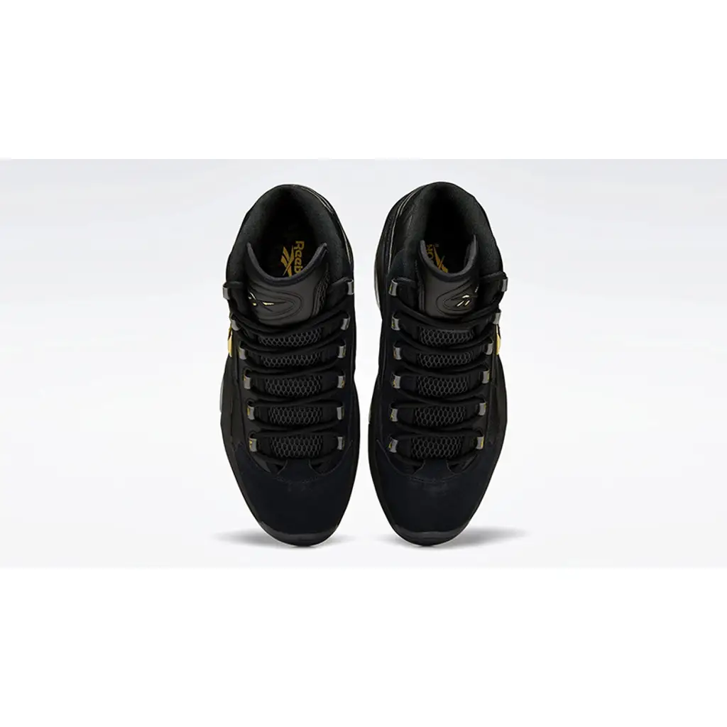 The Reebok Question Mid Lux Black Metallic Gold is one of the most luxurious-looking pairs you’ll ever see. Its opulent design boasts supple jet black smooth full-grain leather upper that’s complemented by a quilted tongue and collar that are made from the same deluxe material.