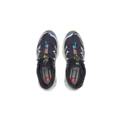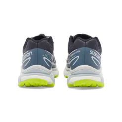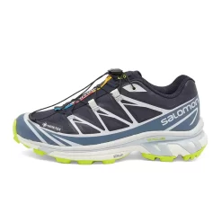 This XT-6’s upper has a mesh base in navy-looking Night Sky blue with a heavy-duty Gore-Tex membrane to keep your feet comfy and dry even in wet weather conditions. TPU overlays wrap around the shoe in white and China Blue. A Gore-Tex brand tab can be found on the lateral forefoot while Salomon brand on the lateral and medial heel panels. The tongue features Salomon branding in white, black, blue, red and yellow. The reinforced lacing system with an accompanying lace-lock promises to keep your feet secure, keeping out unwanted debris. A white and light blue EVA midsole and a neon yellow outsole equipped with ContraGrip cap off the design of this sneaker.