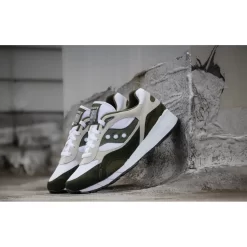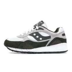 The structure of the shoe follows the brands OG version. This mixed green and white combined colorway features a blend of white mesh with grey nunbuck and green leather. This shoe also offers a stylish Saucony OG Running Man logo embroidered on the tongue level with a red suede and a black sole.