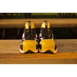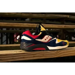 This Motorcross edition of the Saucony Grid 9000 is dressed in a great combination of blue, chili pepper red and mimosa yellow colourway. It is crafted with a mixture of suede and nylon rip-stop throughout the upper that details Pushas birth year 77 stitched in red on the toe. There is also Motorcross writing on the tongue. The shoe is finished with a black out-sole.