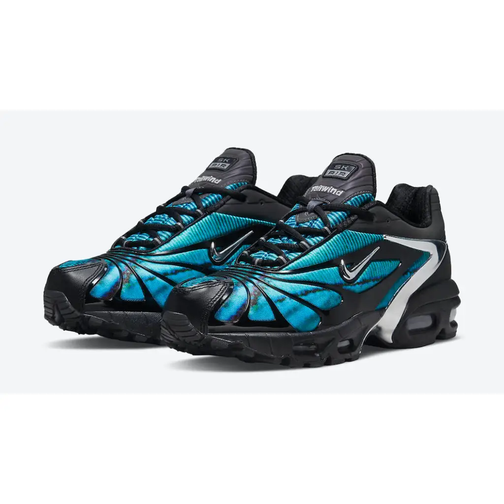 Elsewhere, chrome silver finishes adorn the midfoot mini Swoosh emblems and the rear heel clip, joined with an SK Air logo on the iridescent-shaded tongues, and a set of visible Air unit fitted within the rugged midsoles compete the co-branded Nike trainers.
