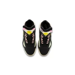 This Shaq Attaq has a black nubuck base, mid-panel windows and Reebok mid-foot stripes. This is all the better to show off the shaggy mint-green mid-panels, the shaggy beige collars, the pink TPU eye stays and the periwinkle blue eye stay panel accents. The titular 3D yellow Smiley stands out on the tongue’s PUMP bubble and the yellow co-branding on the lateral mid-panel. A black-and-beige sole unit completes the design of this shoe.