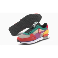 Dressed in a vibrant array of colours including red, purple, green, yellow and more, the pair are crafted from a luxury blend of fabrics such as suede, mesh and synthetics. The retro panelling creates plenty of texture, while Puma’s formstrip logo runs across each side. The Hundreds’ iconic bomb logo is placed on the lateral side via a tab for a dual-branded touch.