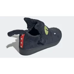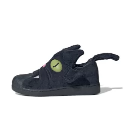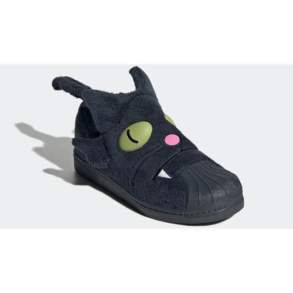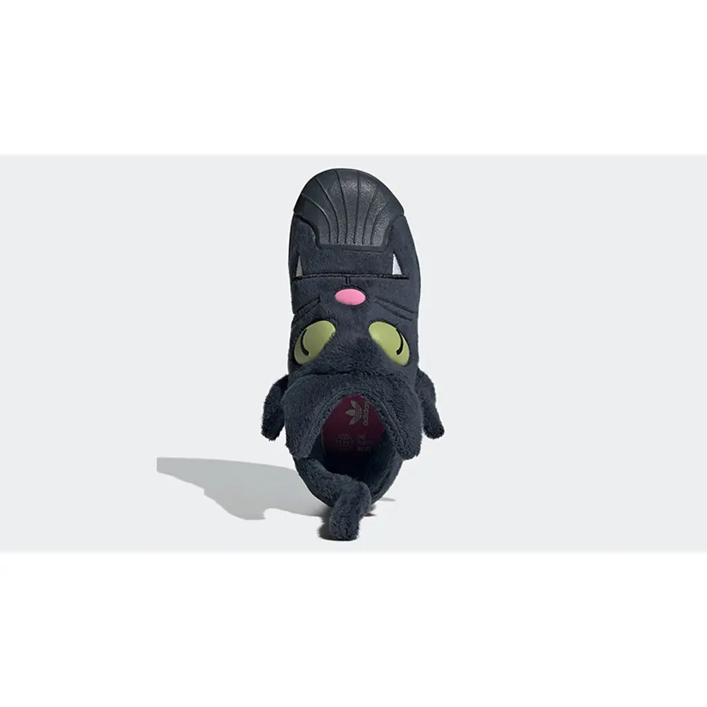 The usual smooth leather base and overlays are traded for a soft black furry upper embellished with green cat eyes, a pink circular nose and white fangs embroidery. Meanwhile, the model’s sturdy toe cap takes on a lighter shade of black. Completing these adidas Superstars are the cute cat ears attached to the counter area and the long black tail at the heel tab. It’s time to unleash your cat-titude with this pair!